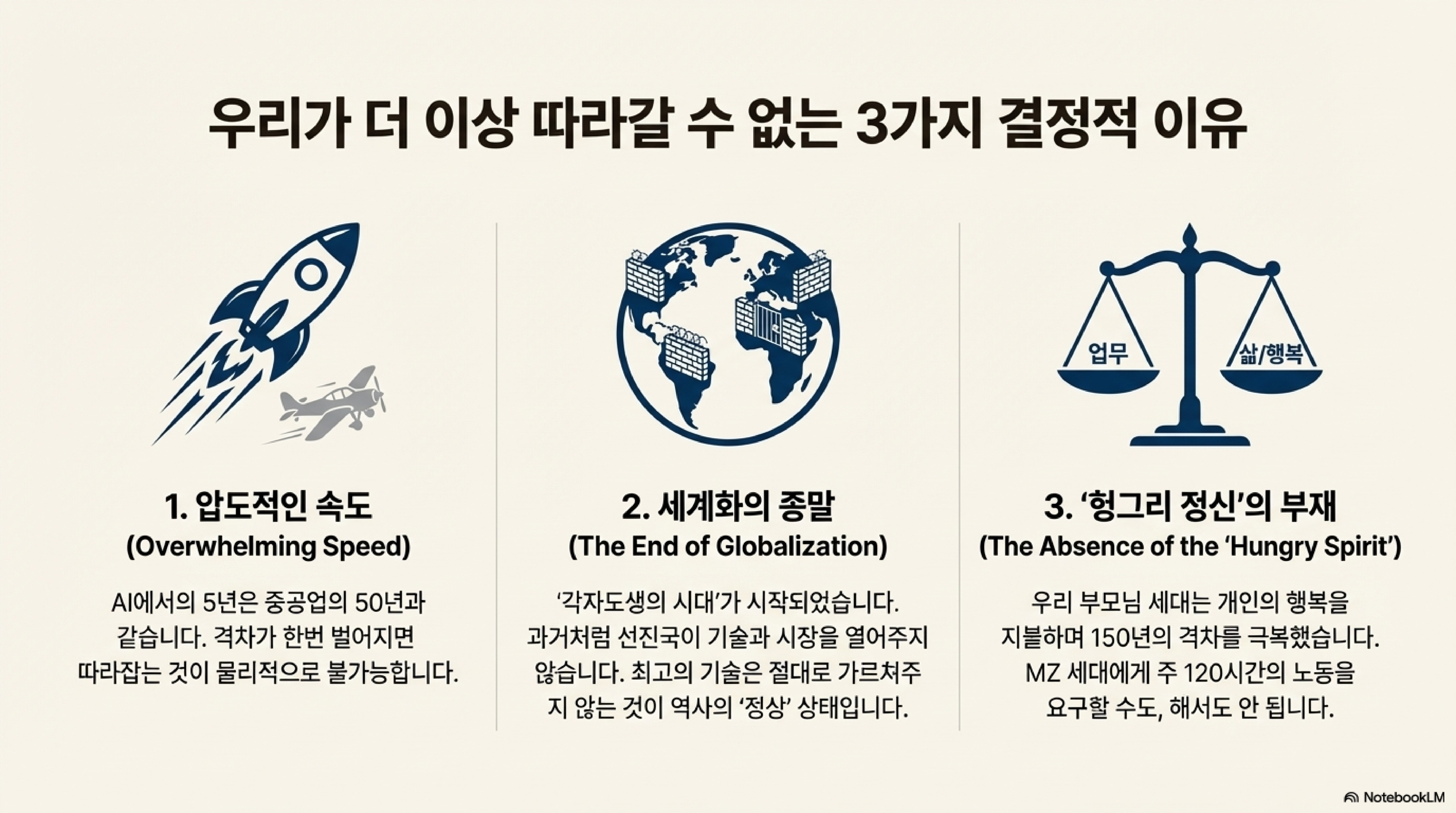 - 속도의 차원: AI 시대의 5년은 중공업 시대의 50년과 맞먹습니다. 기술 발전의 속도가 너무 빨라 격차가 한번 벌어지면 따라잡는 것 자체가 불가능합니다.