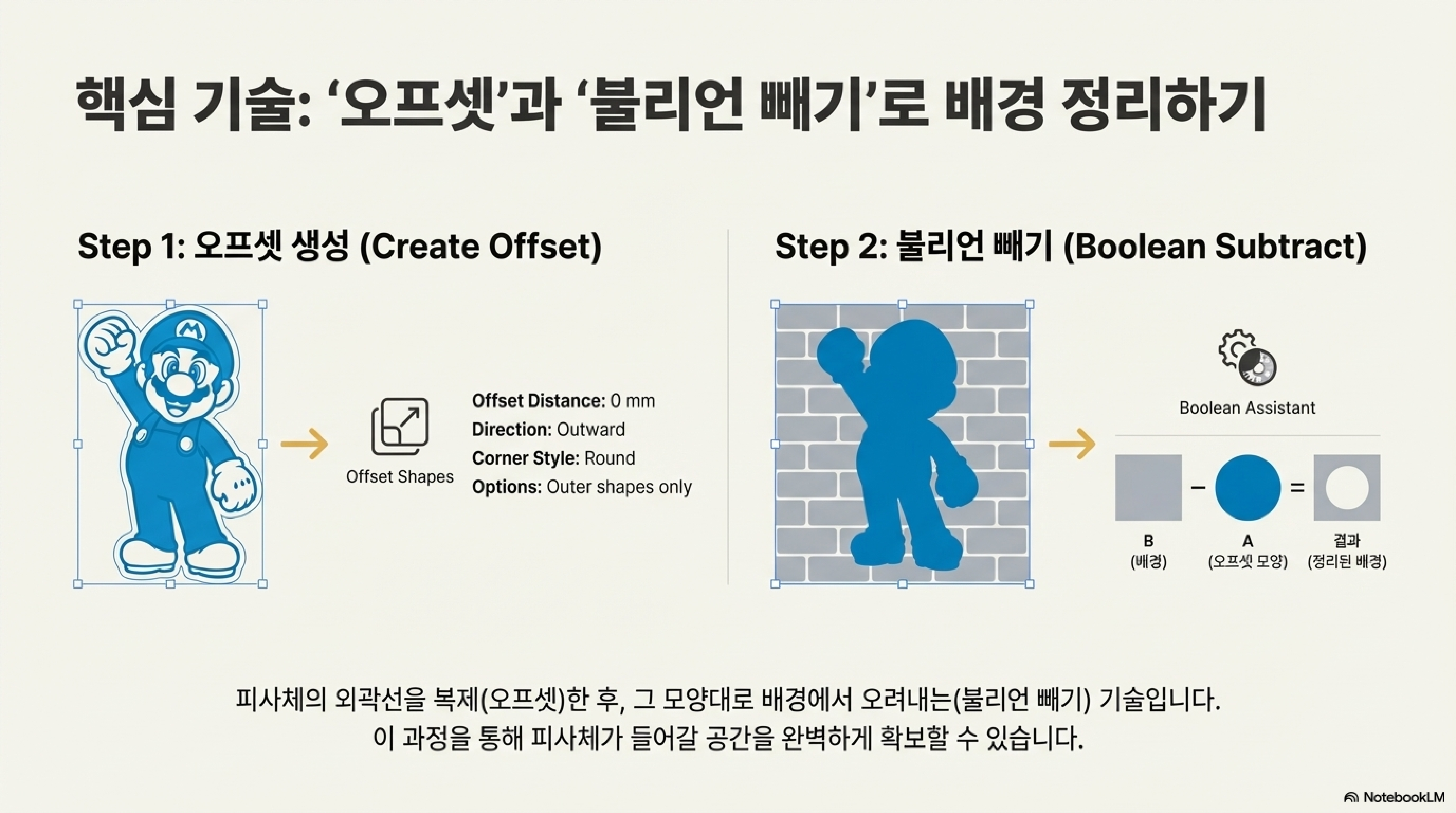 먼저 많은 분들이 사용하는 일반적인 배경 추가 기법, 즉 '레벨 2'를 살펴보겠습니다. 이 방법은 주 피사체와 배경 디자인을 준비한 뒤, LightBurn의 '도형 오프셋'과 '불리언 빼기' 기능을 사용하여 주 피사체 모양대로 배경을 깔끔하게 잘라내는 것입니다.