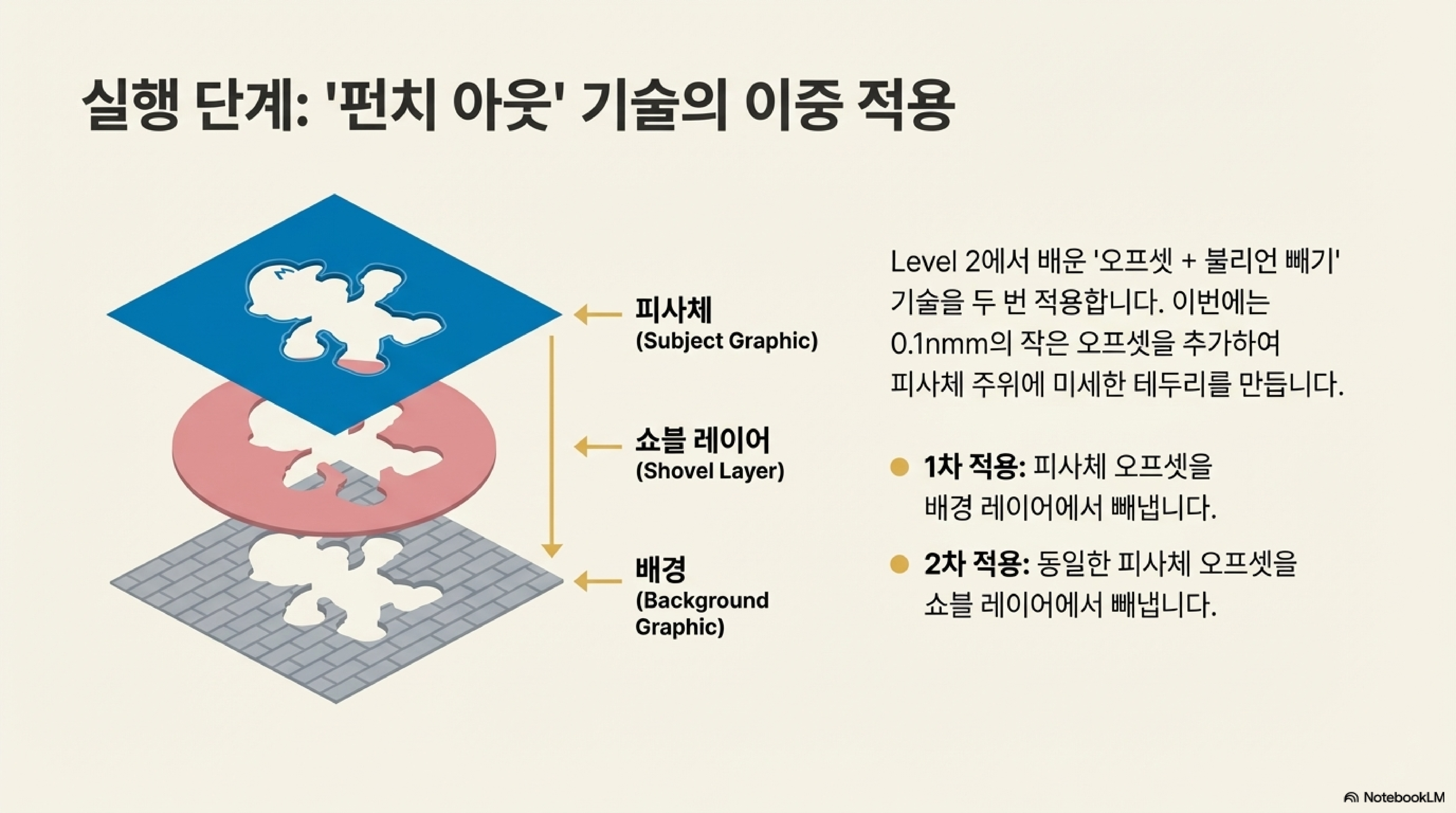 삽 레이어의 역할은 이름 그대로입니다. 실제 배경 디자인을 새기기 전에, 배경이 될 영역의 재료를 미리 깊게 파내는 것입니다. 만드는 과정도 간단합니다. 전체 각인 영역과 동일한 크기의 도형을 만든 뒤, 주 피사체에 약간의 오프셋을 적용한 모양을 불리언 빼기(Boolean Subtract) 연산으로 제거하면 됩니다. 이렇게 하면 주 피사체가 들어갈 자리는 비어 있고 나머지 배경 영역만 채워진, 말 그대로 재료를 파낼 '삽' 모양의 레이어가 완성됩니다.