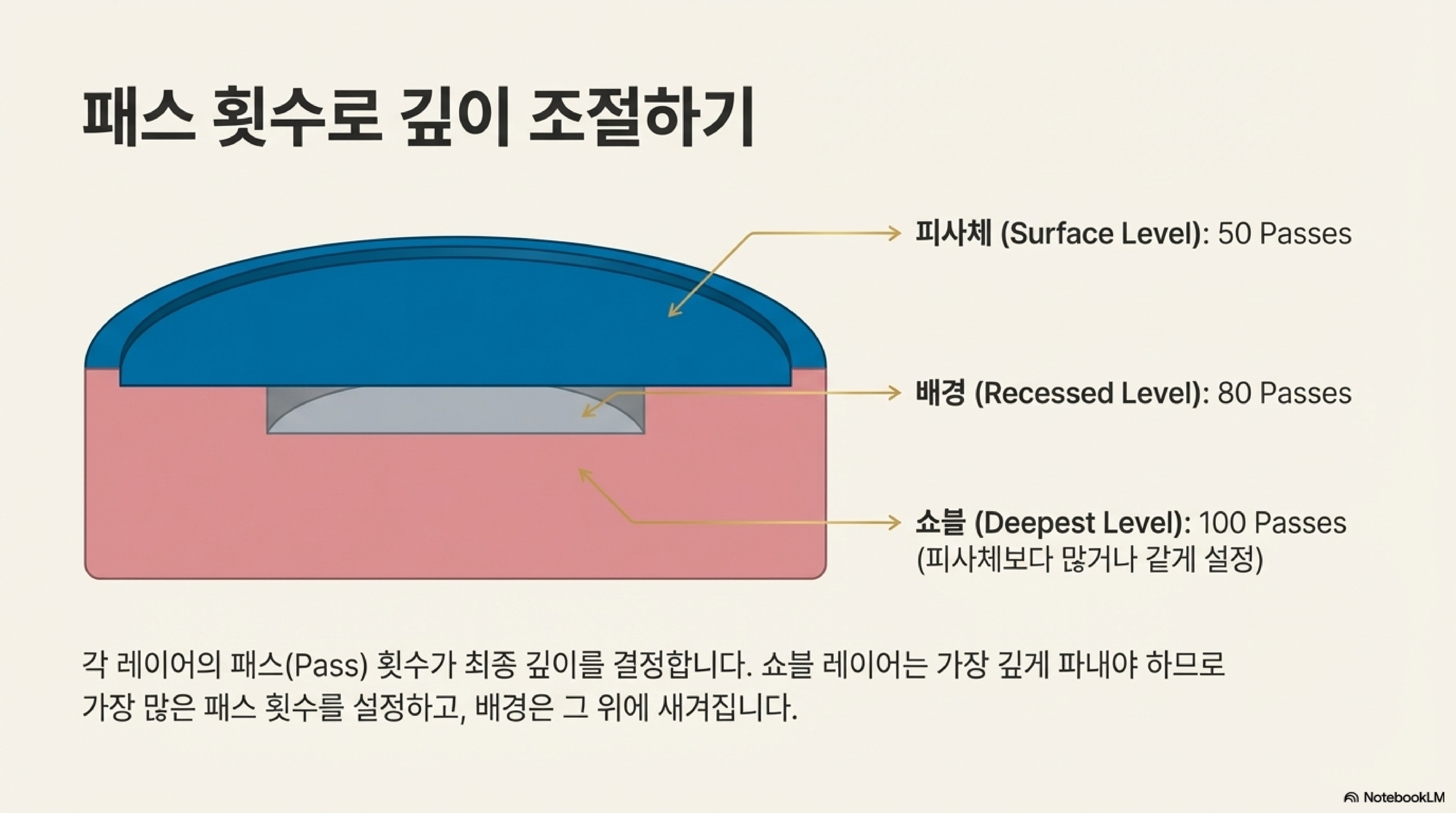 각 단계의 패스 횟수가 다른 이유는 명확한 목적이 있기 때문입니다. **삽 레이어(100 패스)**는 배경을 위한 '참호'를 파는 유일한 임무를 가졌기에 가장 많은 패스가 필요합니다. **주 피사체(50 패스)**는 가장 높은 지점이므로 가장 적은 패스가 필요합니다. 마지막으로 **배경(80 패스)**은 이미 파놓은 참호 안에 새겨지므로, 삽 레이어보다는 적지만 충분한 패스를 통해 깊이감 있는 질감을 만들어냅니다.