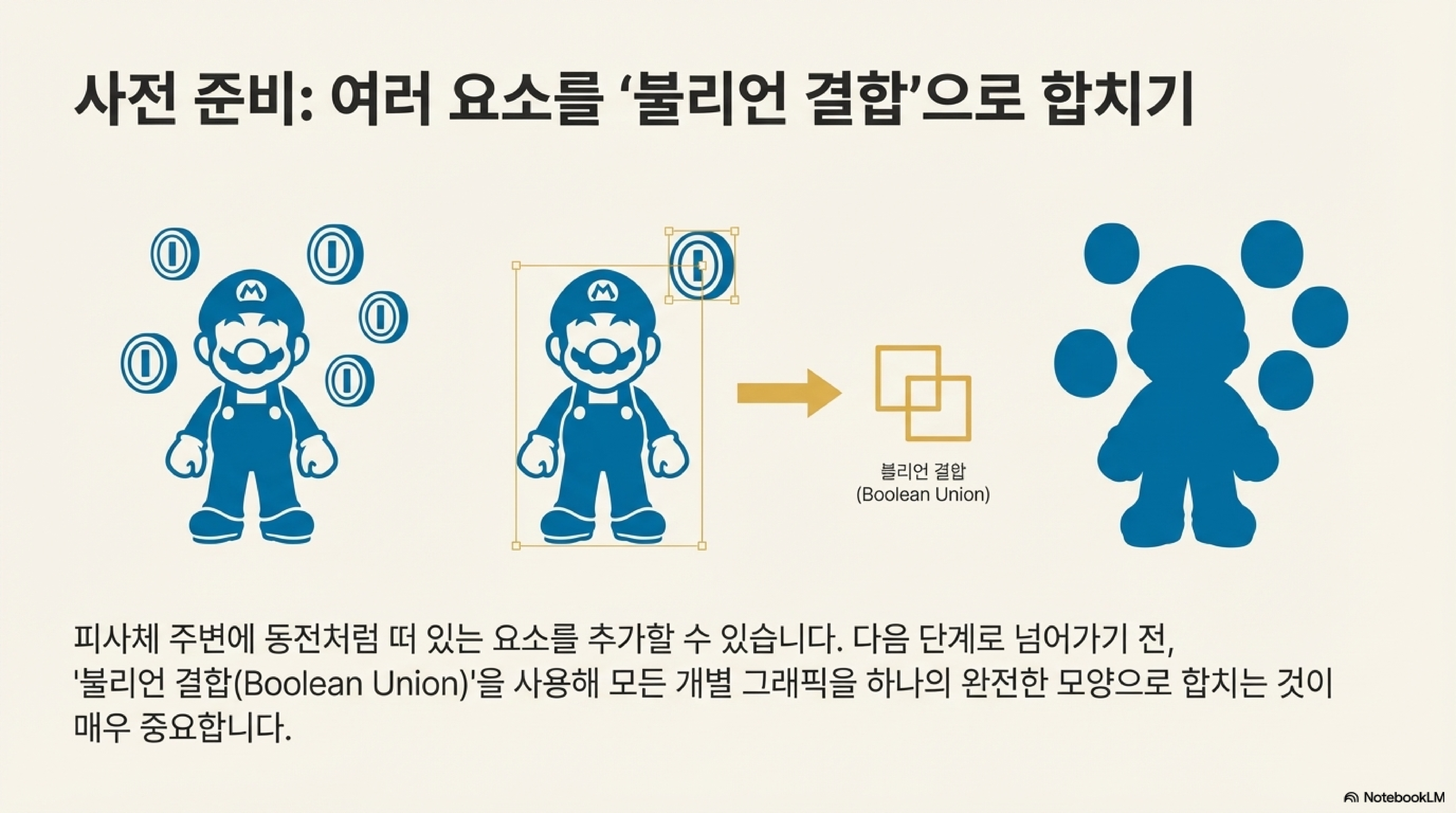 여기서 초보자들이 흔히 겪는 문제가 있습니다: 주 피사체와 떨어진 여러 개의 그래픽이 있을 경우입니다. 만약 주 피사체 주변에 동전처럼 떨어져 있는 작은 그래픽들이 있다면, 오프셋과 빼기 작업을 하기 전에 반드시 이 모든 요소를 '불리언 합치기(Union)'를 통해 하나의 개체로 만들어야 합니다. 이렇게 해야 LightBurn이 모든 요소를 하나의 그룹으로 인식하여 전체를 아우르는 올바른 오프셋을 생성할 수 있습니다.