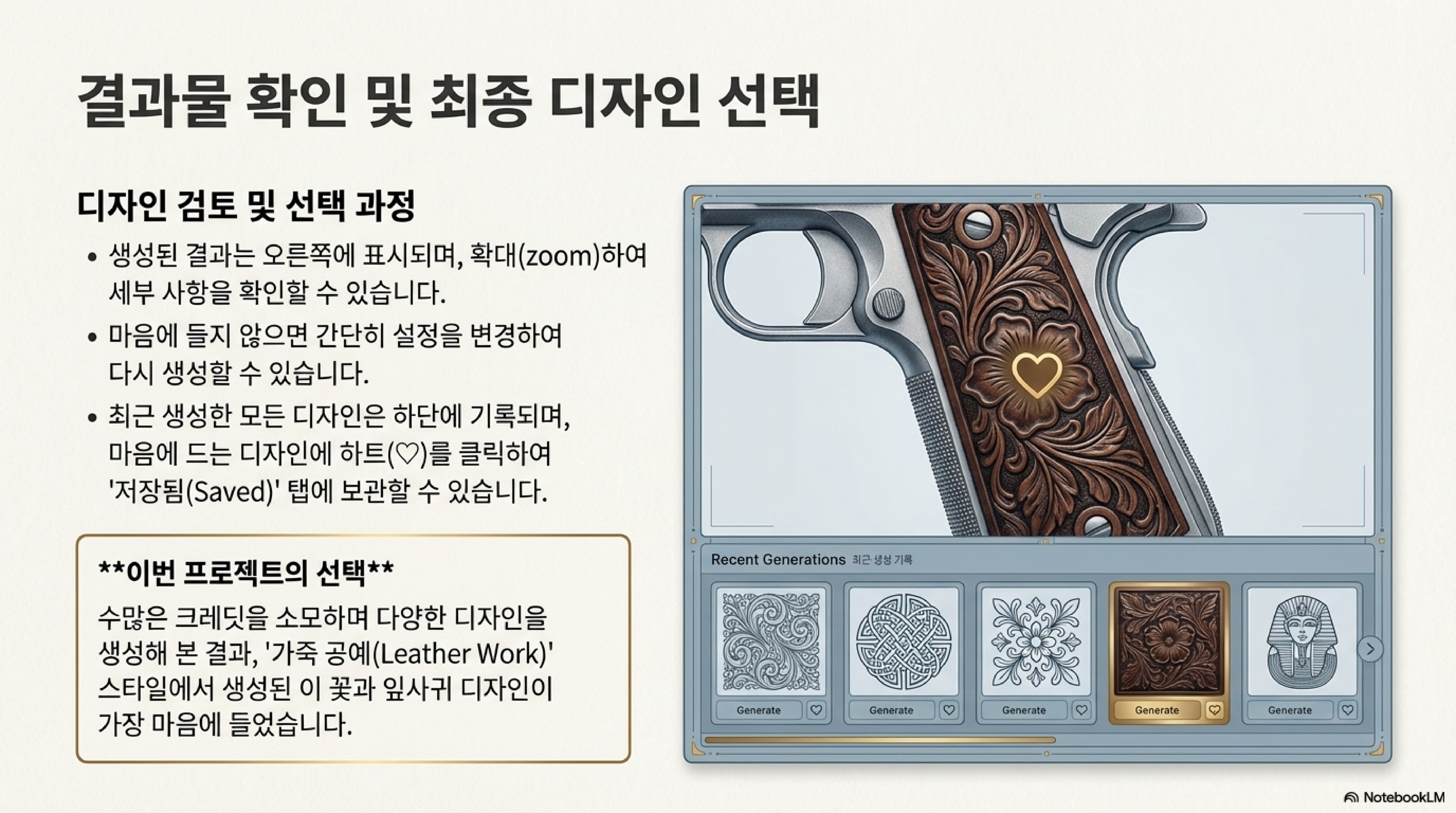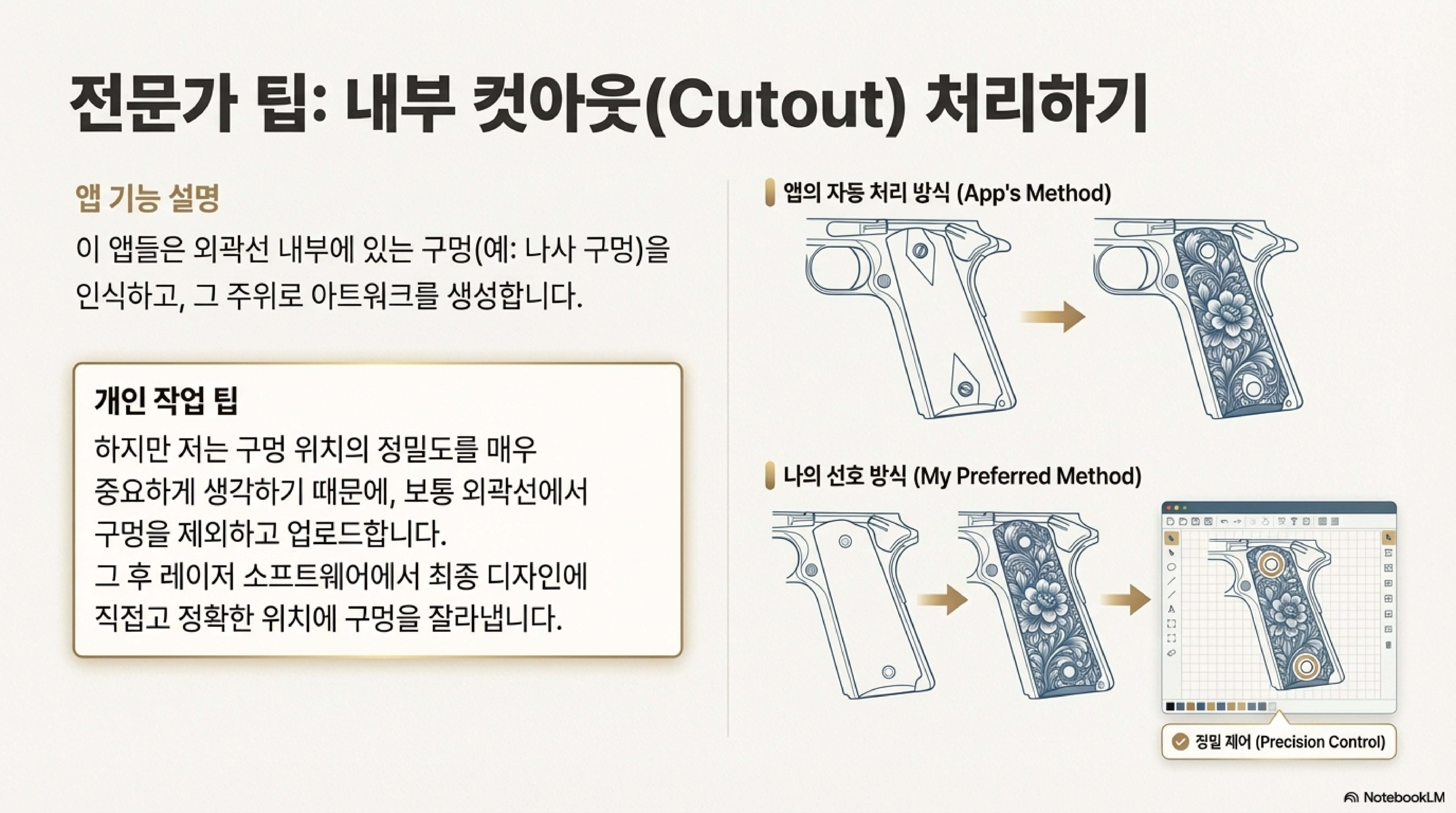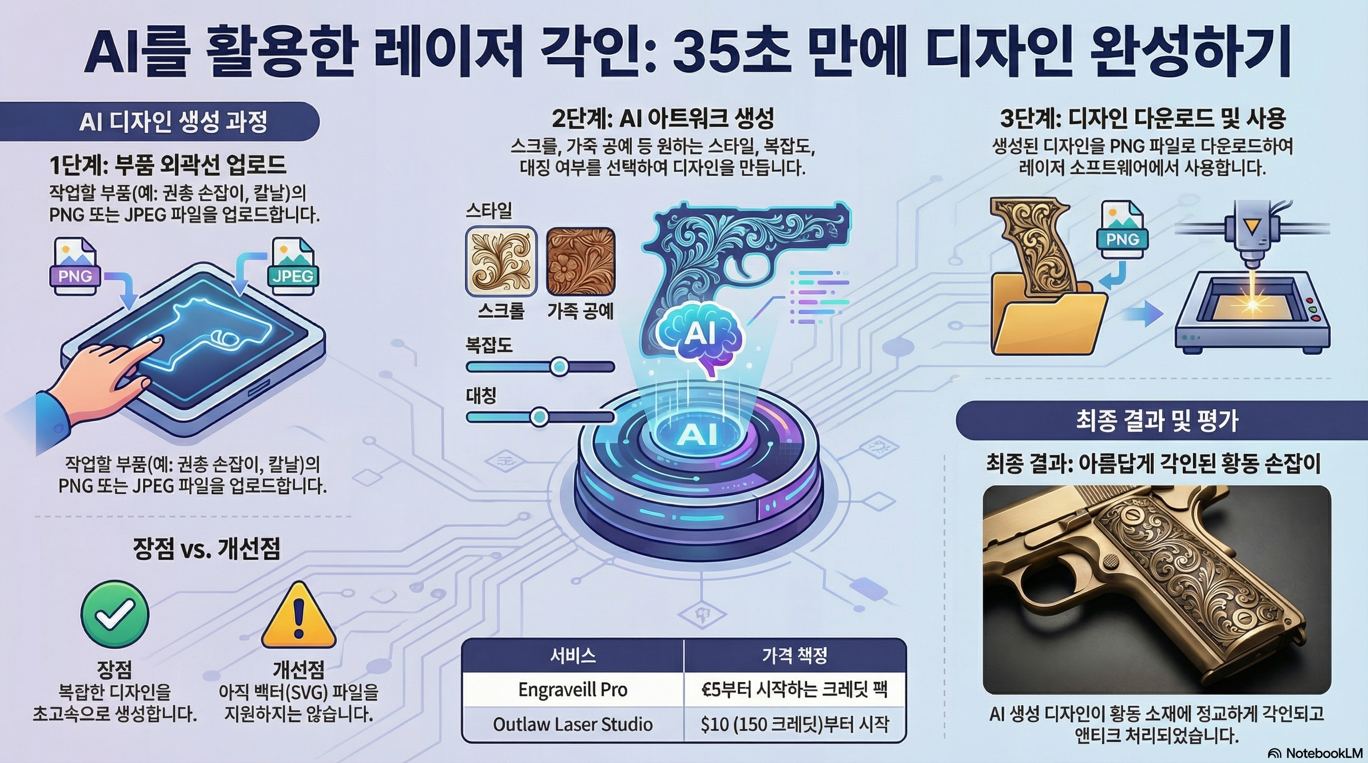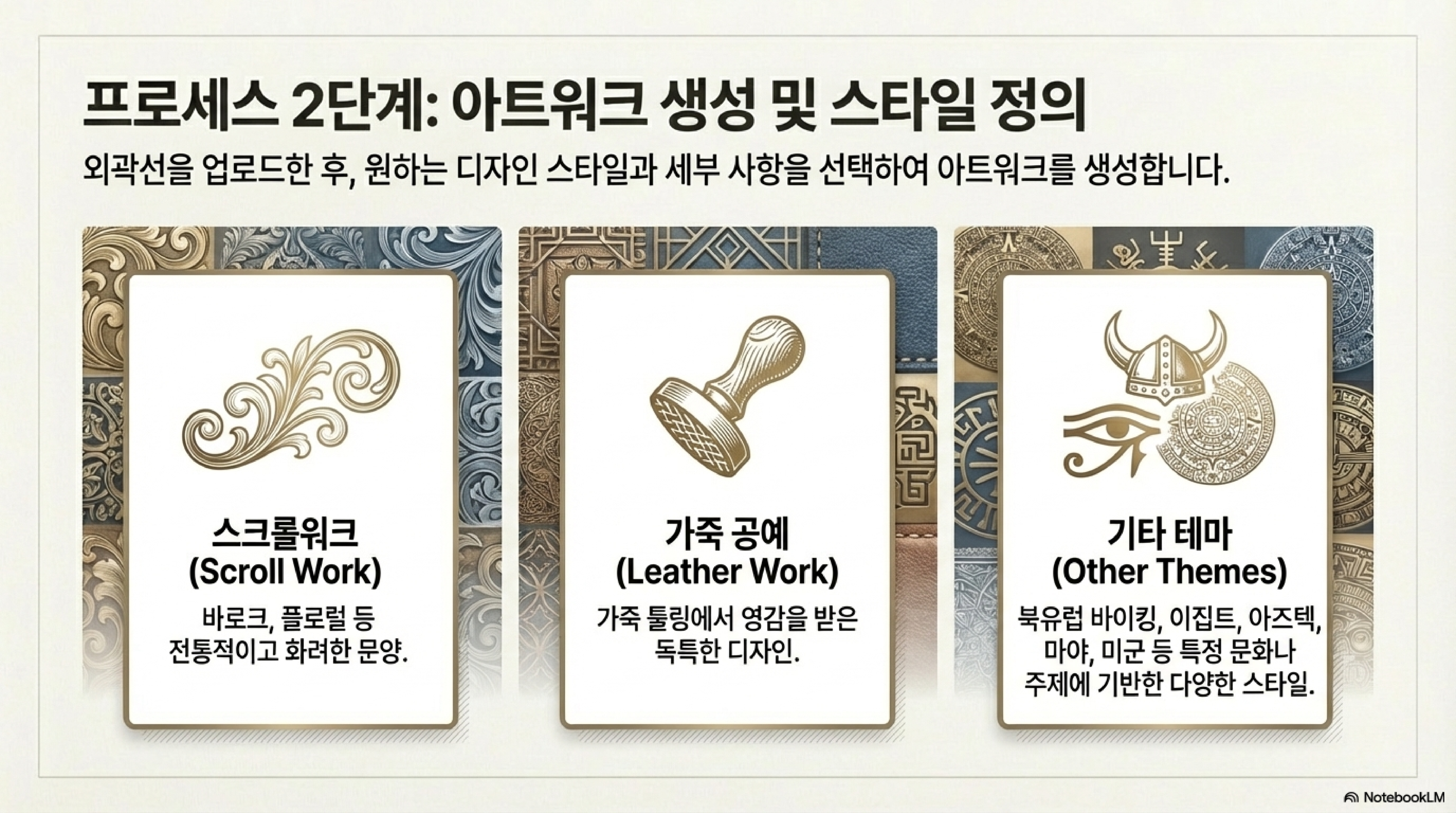 이 AI 디자인 앱들의 핵심 기능은 놀라울 정도로 간단하고 강력합니다. 사용자가 칼날, 권총 손잡이, 지갑처럼 각인하고 싶은 제품의 외곽선(템플릿) 파일을 업로드하면, AI가 그 공간을 순식간에 화려한 스크롤 워크나 다양한 테마의 모티프로 가득 채워줍니다.