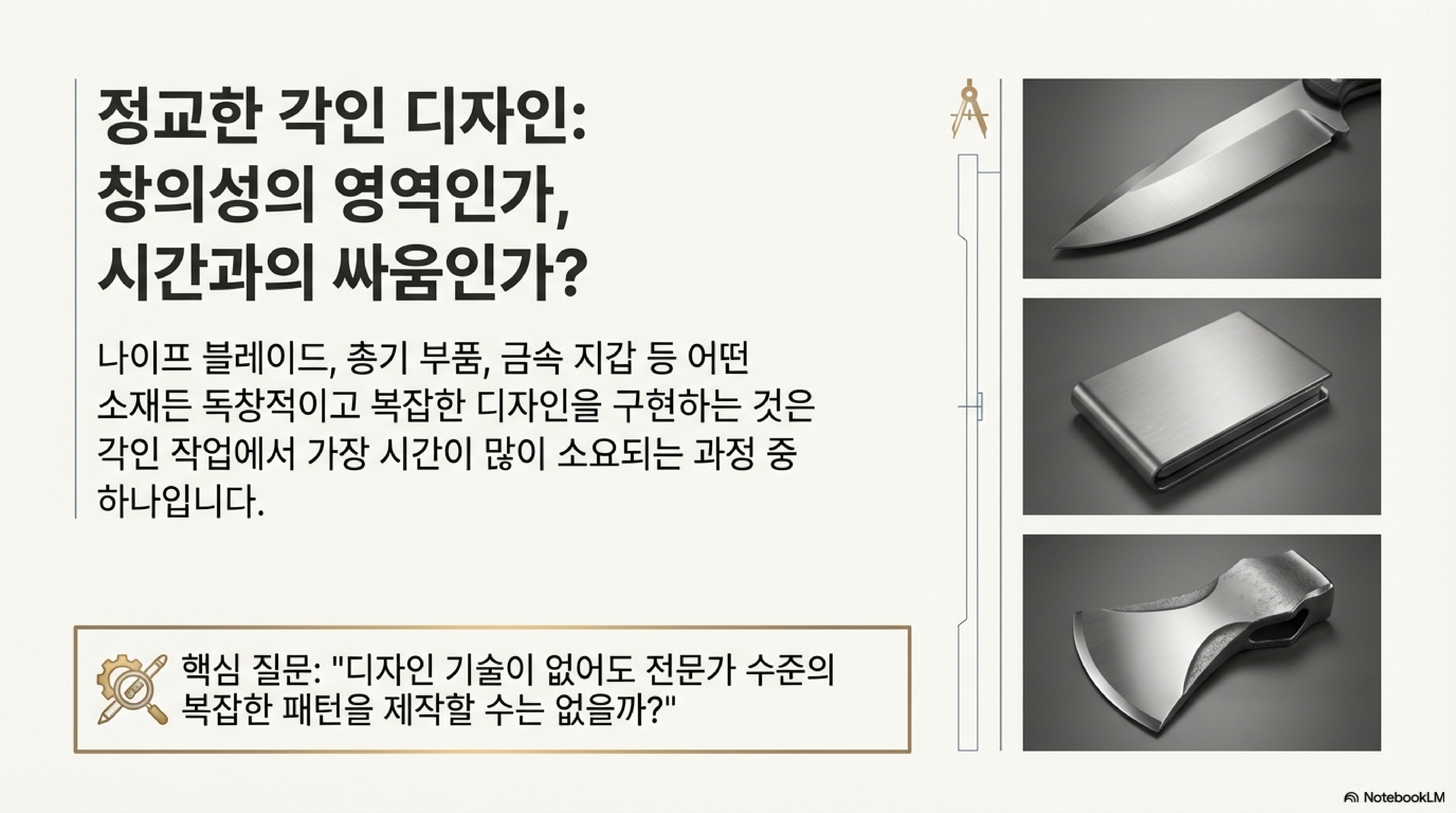 레이저 각인이나 CNC 작업을 하는 창작자라면 누구나 한 번쯤 정교하고 복잡한 그래픽 디자인 앞에서 막막함을 느껴본 적이 있을 겁니다. 아름다운 스크롤 워크나 패턴을 칼날, 권총 손잡이, 가죽 지갑에 새기고 싶지만, 전문적인 디자인 기술이 없어 아이디어를 실현하지 못하는 경우는 흔한 일이죠. 이런 창작의 장벽은 많은 메이커들에게 큰 아쉬움으로 남았습니다.