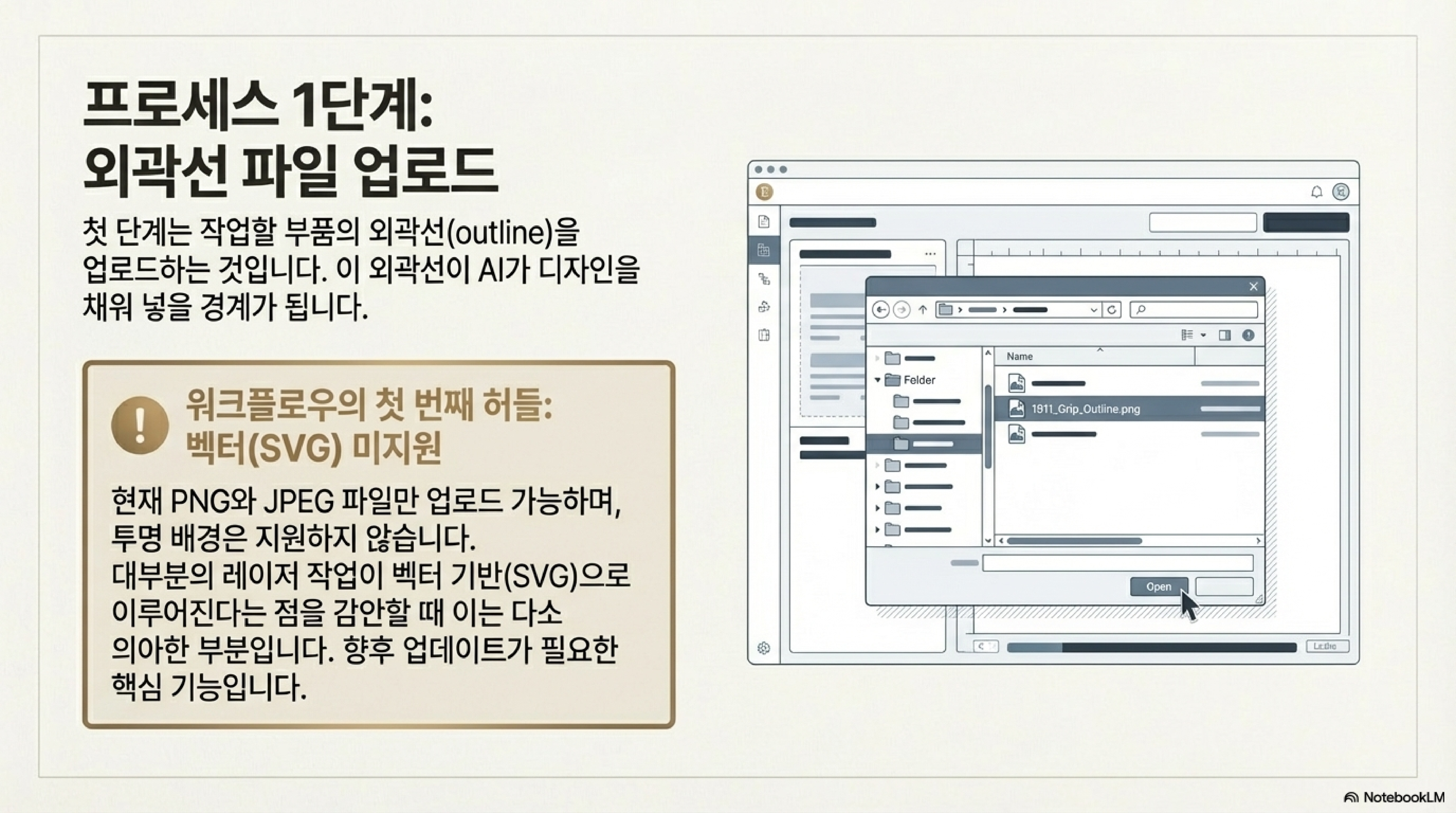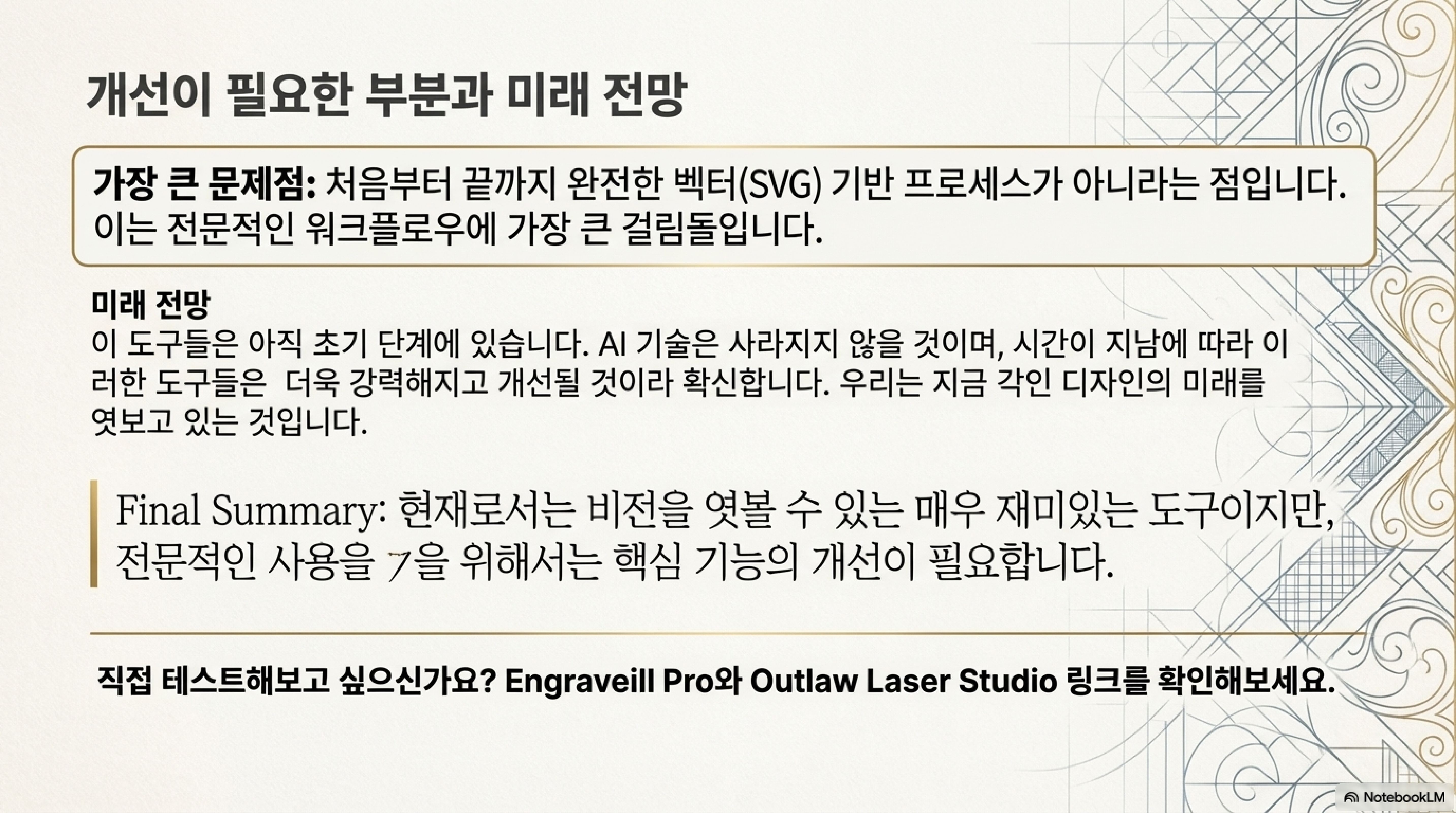 이 지적처럼, 디자인 생성부터 각인까지 매끄러운 워크플로우를 위해서는 벡터 파일 지원이 필수적입니다. 이 부분이 개선되지 않는다면 전문적인 용도로 사용하기에는 한계가 명확해 보입니다.