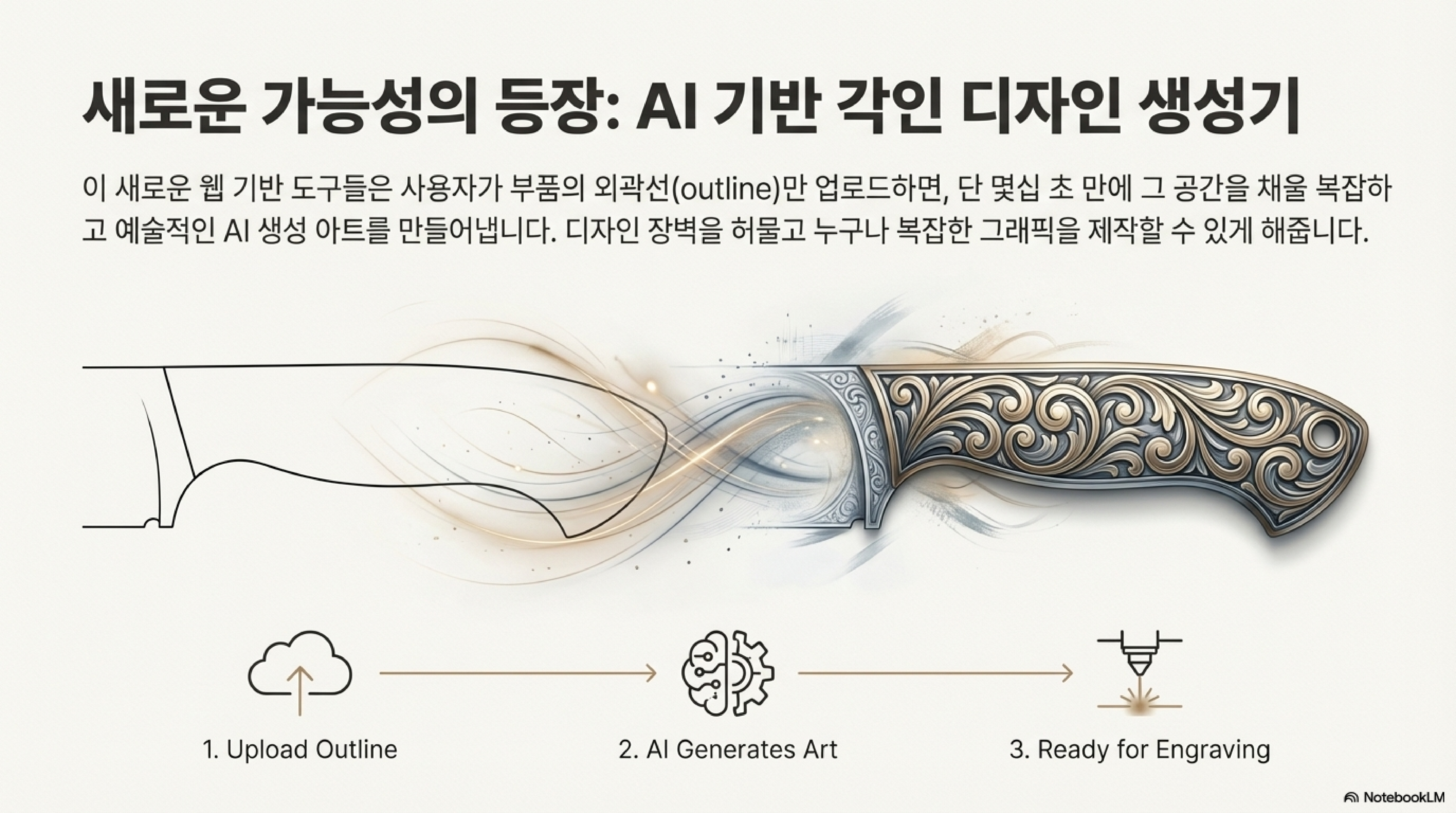 이 AI 디자인 앱들의 핵심 기능은 놀라울 정도로 간단하고 강력합니다. 사용자가 칼날, 권총 손잡이, 지갑처럼 각인하고 싶은 제품의 외곽선(템플릿) 파일을 업로드하면, AI가 그 공간을 순식간에 화려한 스크롤 워크나 다양한 테마의 모티프로 가득 채워줍니다.