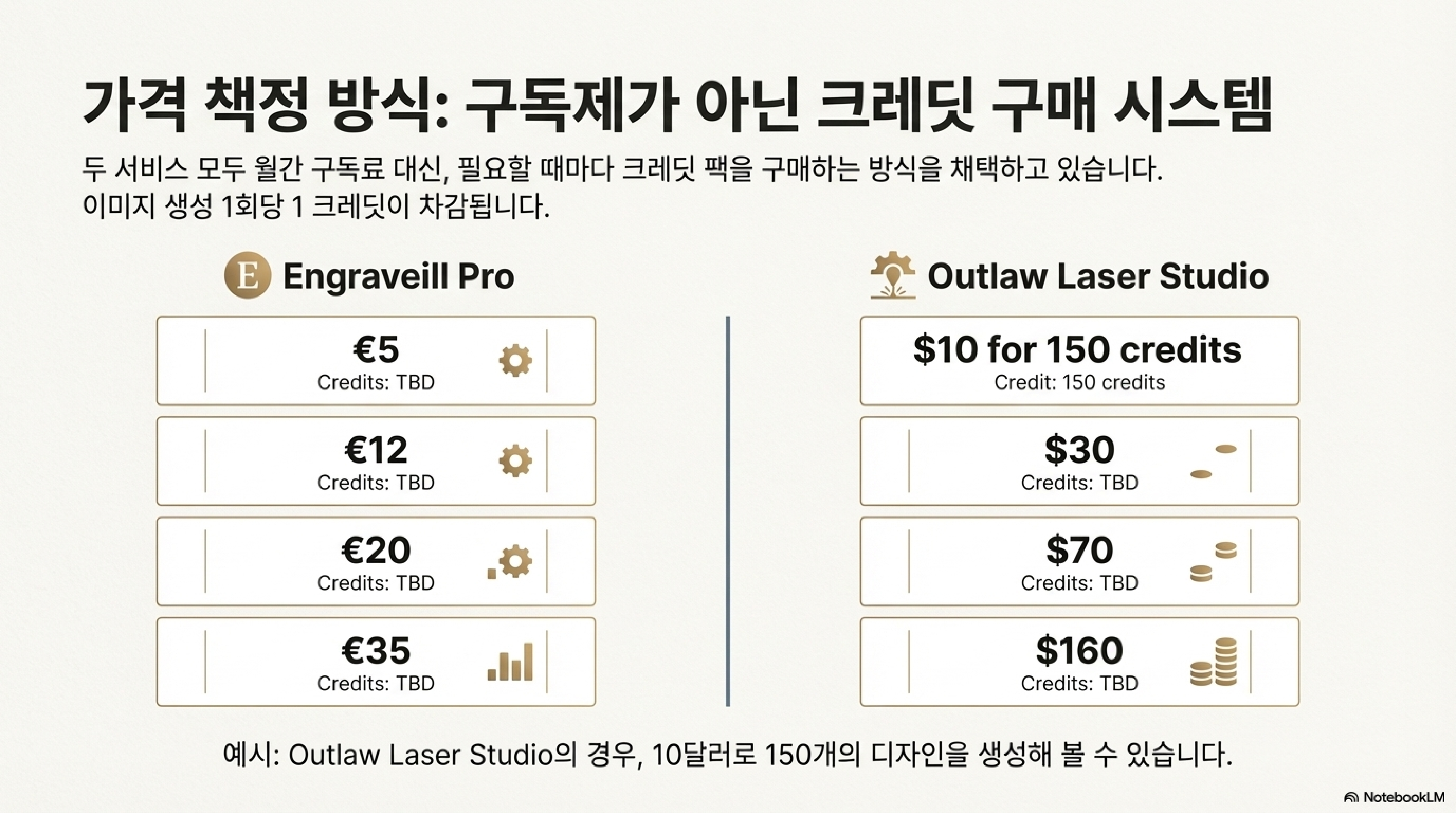 - Outlaw Laser Studio: 달러(USD) 기반의 크레딧 팩을 판매합니다. $10, $30, $70, $160 등의 옵션이 있습니다. 예를 들어 가장 저렴한 $10 플랜은 150 크레딧을 제공하는데, 이는 이미지 150개를 생성할 수 있는 양입니다.