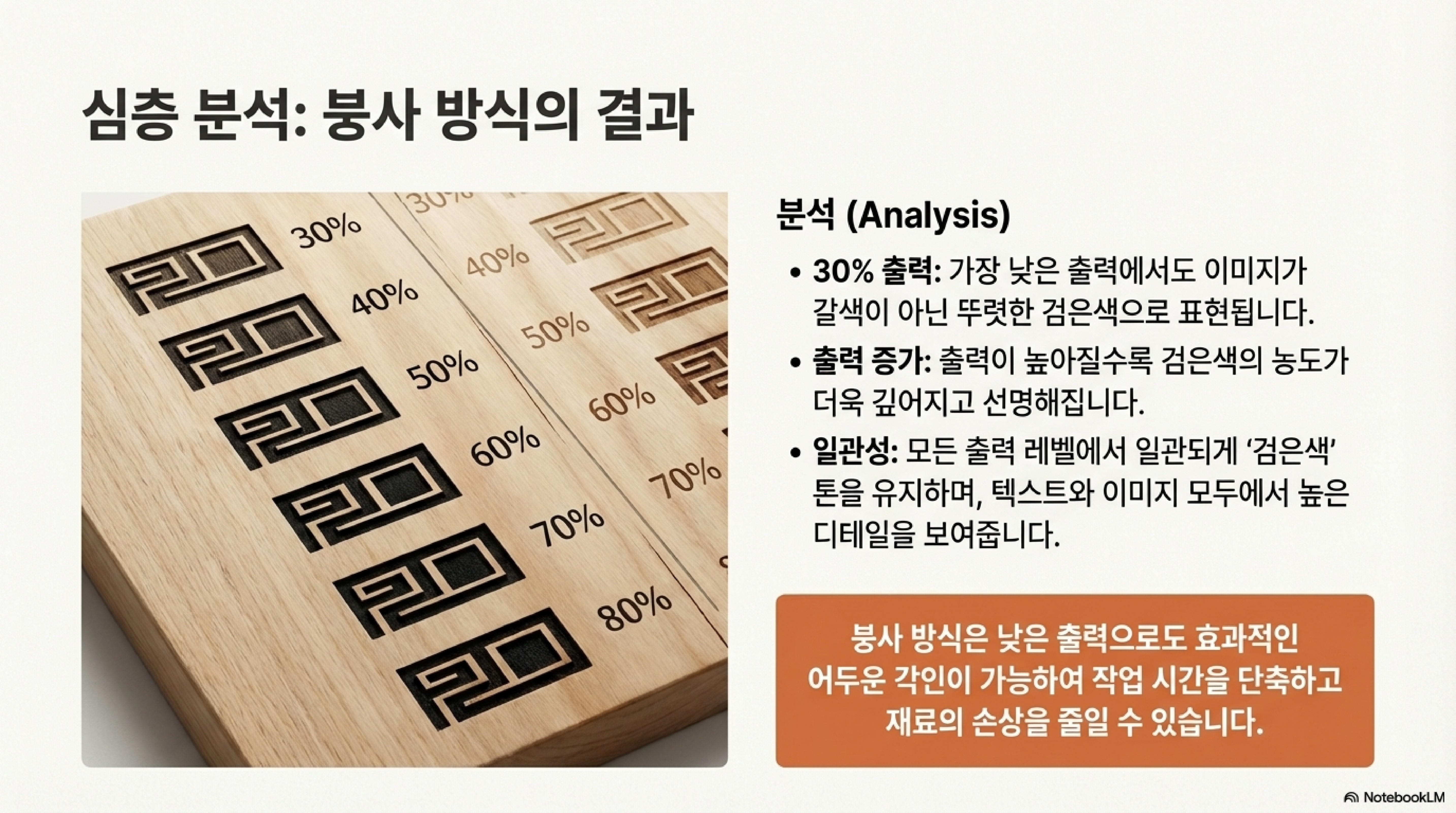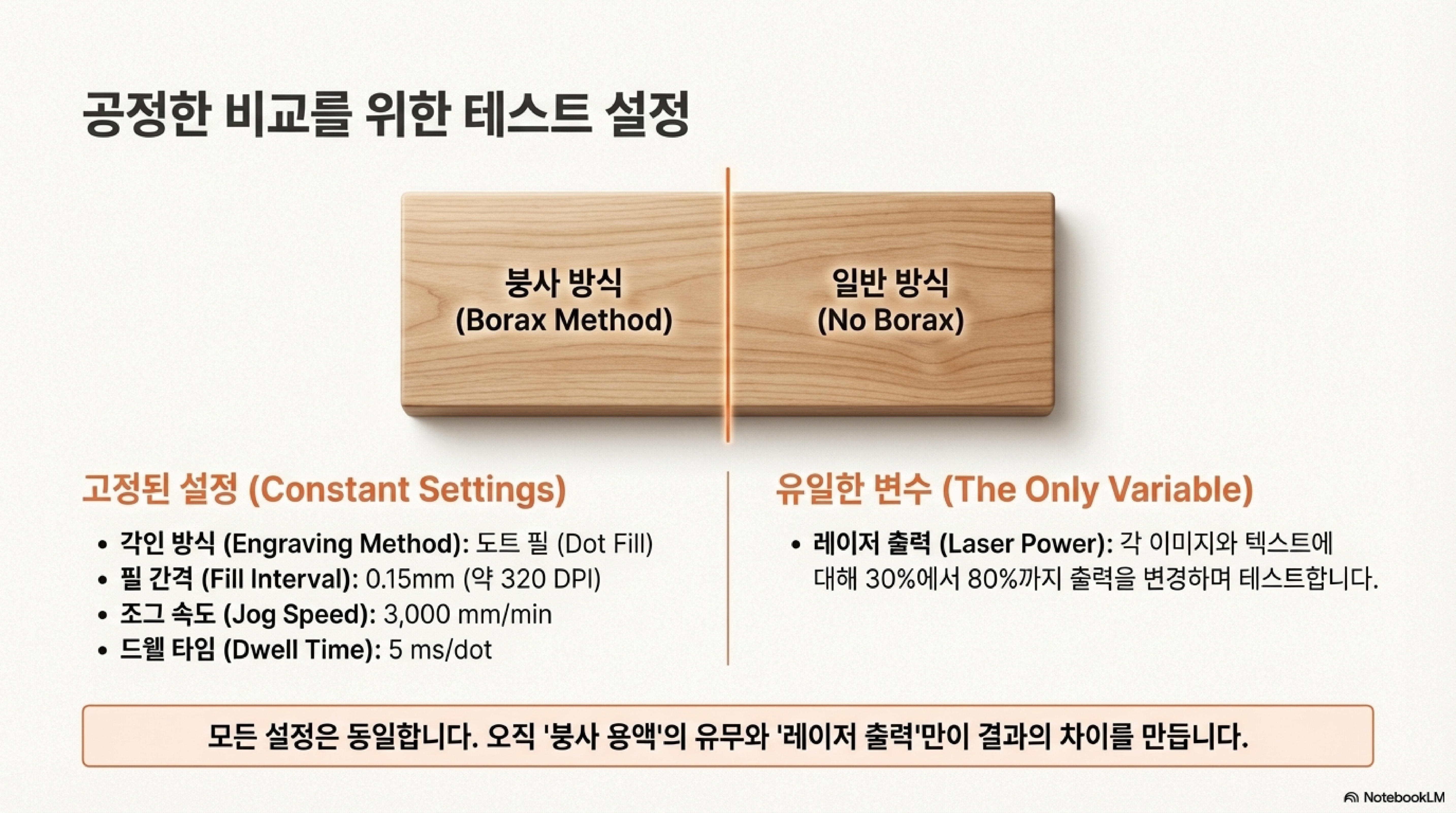 다만 붕사 기법은 낮은 출력에서도 번짐이 더 두드러지는 경향이 있습니다. 예를 들어 3050%의 낮은 출력에서는, 붕사를 쓰지 않은 쪽은 표면에 거의 번짐이 없지만 붕사를 쓴 쪽은 검은 가루가 묻어 나옵니다. 6080% 이상의 높은 출력에서는 깊은 각인 때문에 두 방법 모두에서 번짐이 발생하기 시작합니다.