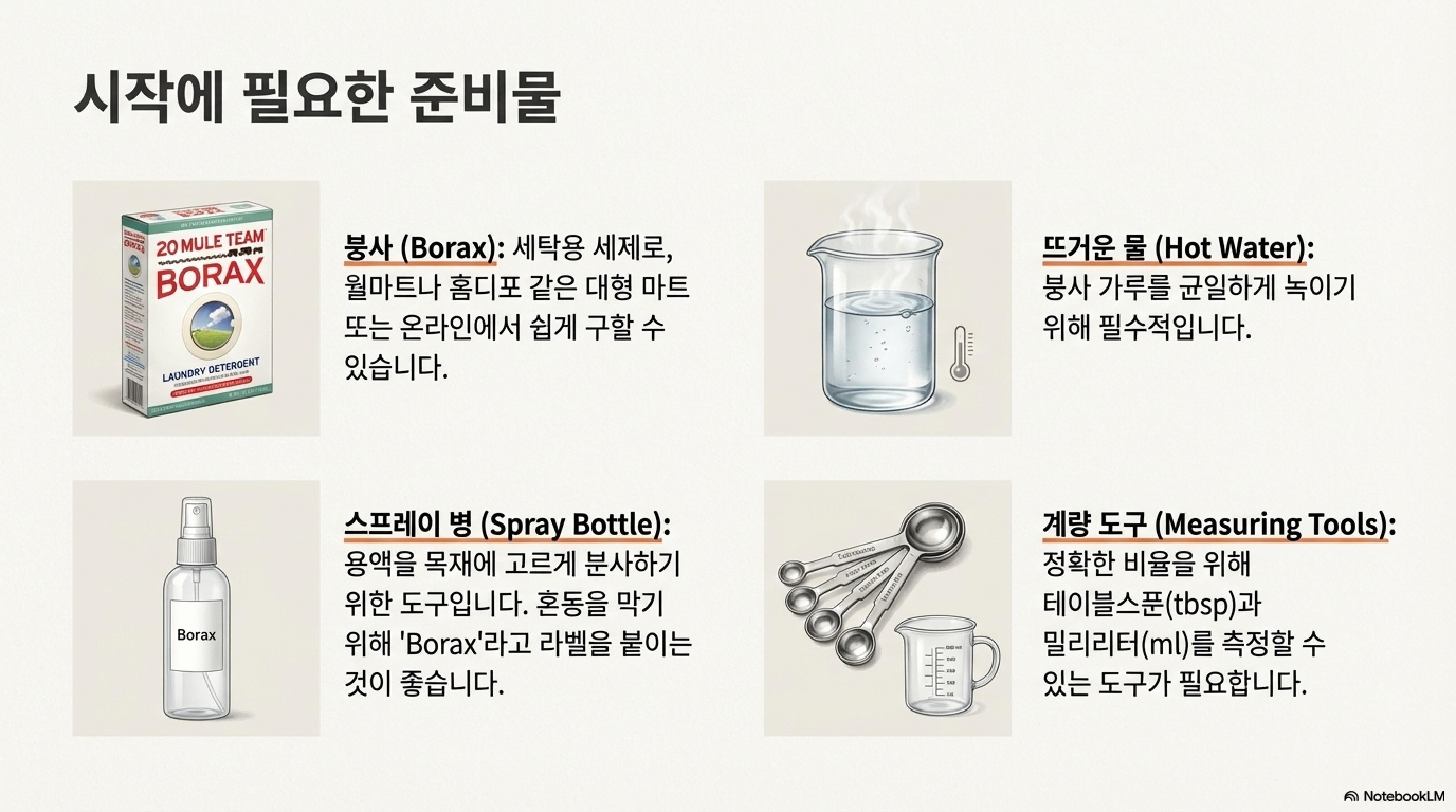 - 용액 만들기: 뜨거운 물 400ml에 붕사 가루 1테이블스푼을 넣고 가루가 완전히 녹을 때까지 잘 섞어줍니다. (뜨거운 물을 사용해야 붕사가 잘 녹습니다.)