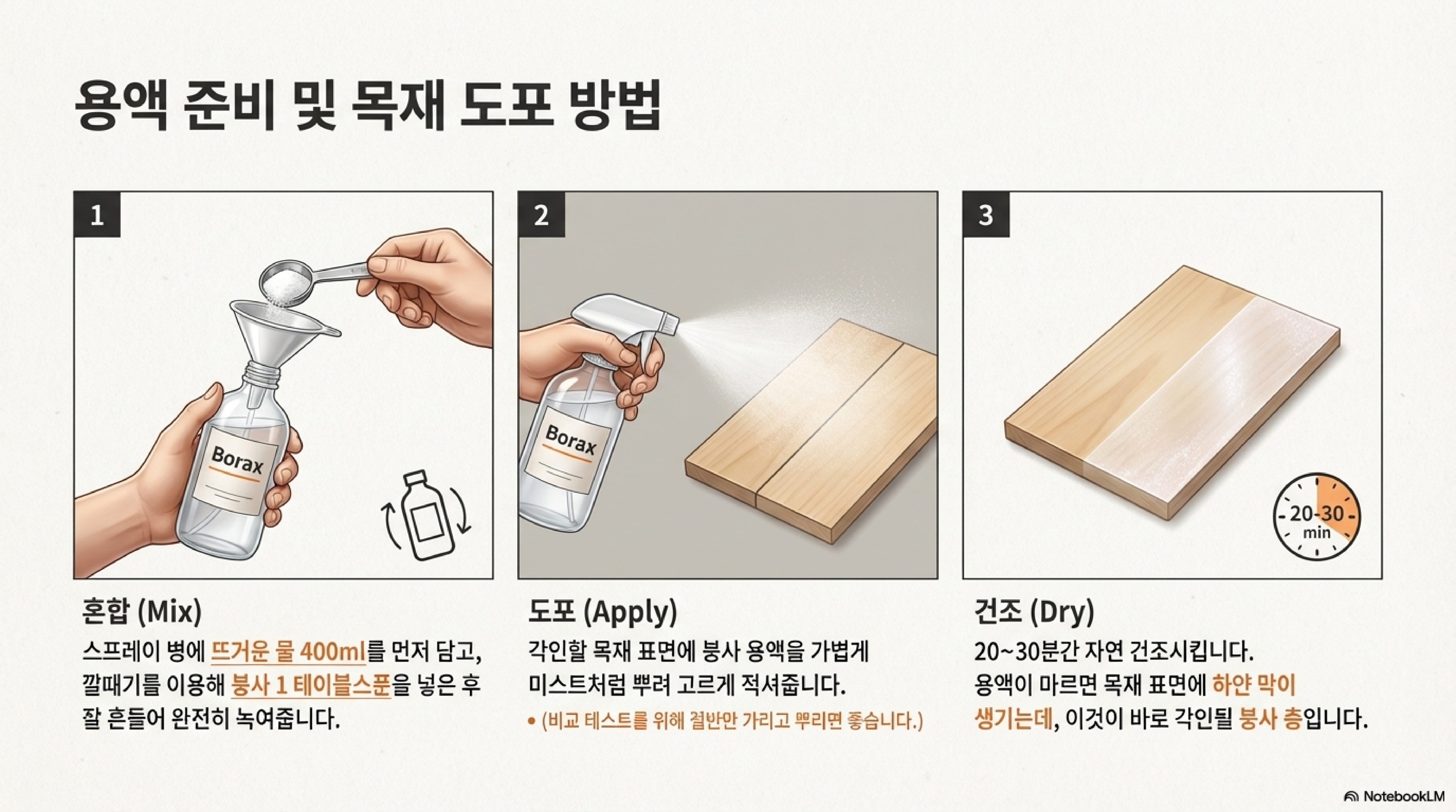- 완전히 건조하기: 용액이 완전히 마를 때까지 20~30분간 기다립니다. 표면이 마르면 붕사 성분 때문에 하얀 막이 얇게 생긴 것을 볼 수 있습니다.