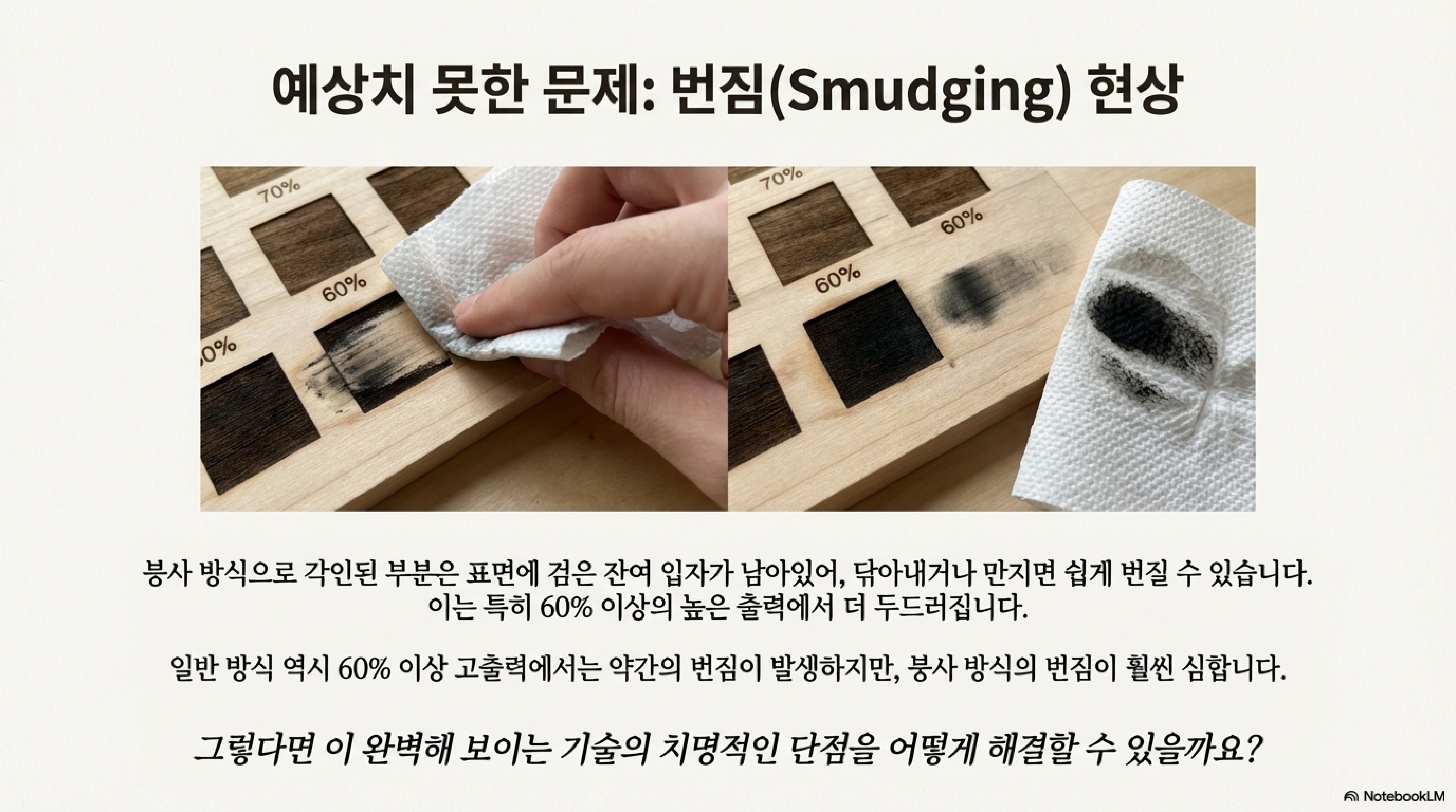 이 기법을 이야기할 때 '번짐' 문제를 빼놓을 수 없습니다. 하지만 이는 붕사 기법만의 단점이라기보다는, 레이저 각인 시 고려해야 할 공통적인 현상에 가깝습니다. 특히 출력을 높여 깊게 각인하면 어떤 방식이든 탄화된 잔여물 때문에 번짐이 발생할 수 있습니다.