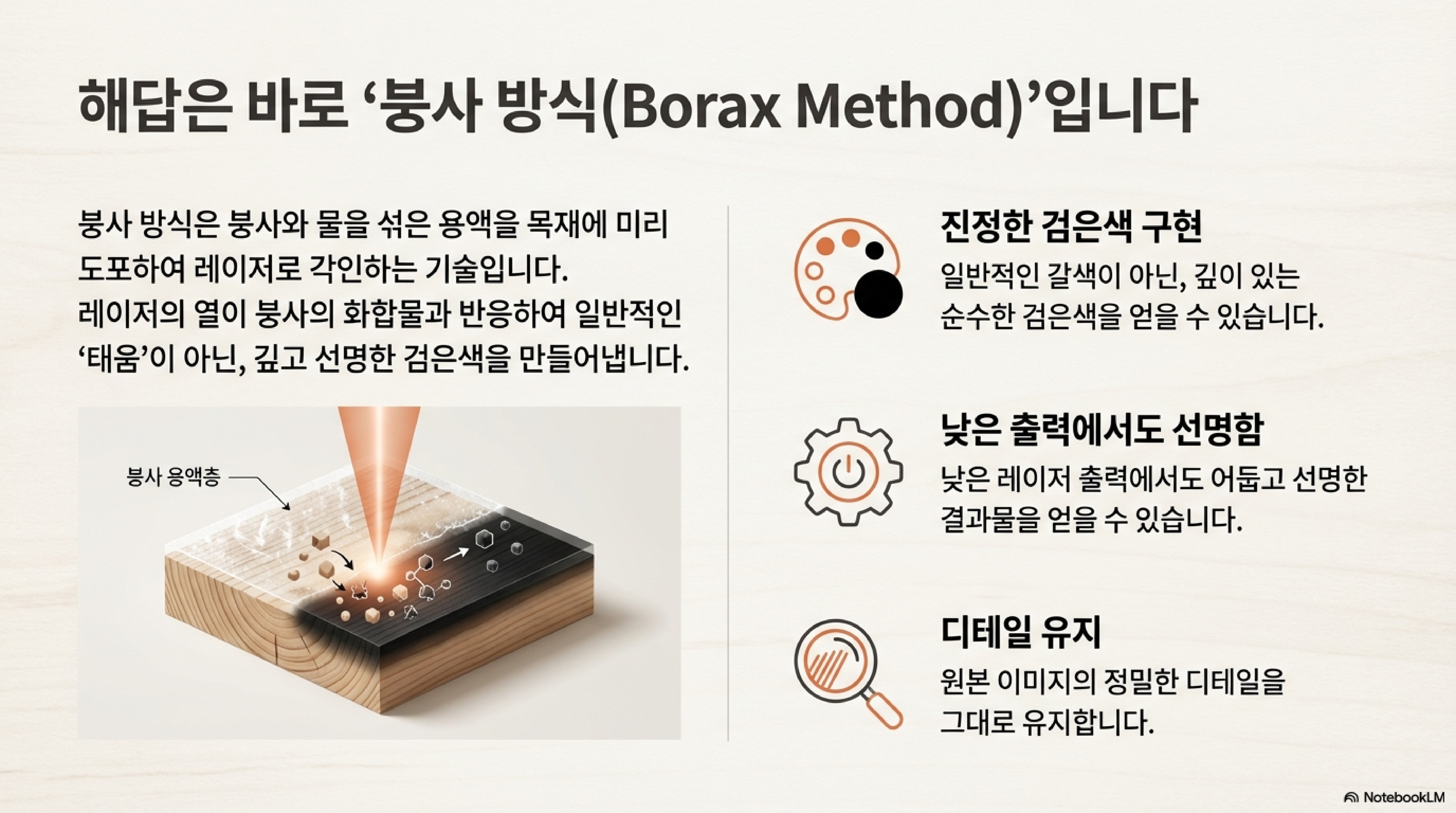 레이저의 열이 나무 표면에 코팅된 붕사 화합물과 직접 반응하여, 목재 섬유를 태워 갈색을 내는 대신 붕사 자체가 검게 변하며 표면에 고착되는 원리입니다. 따라서 디테일의 수준은 붕사를 사용하든 안 하든 동일하게 유지되면서 오직 색상만 극적으로 바뀌게 됩니다.