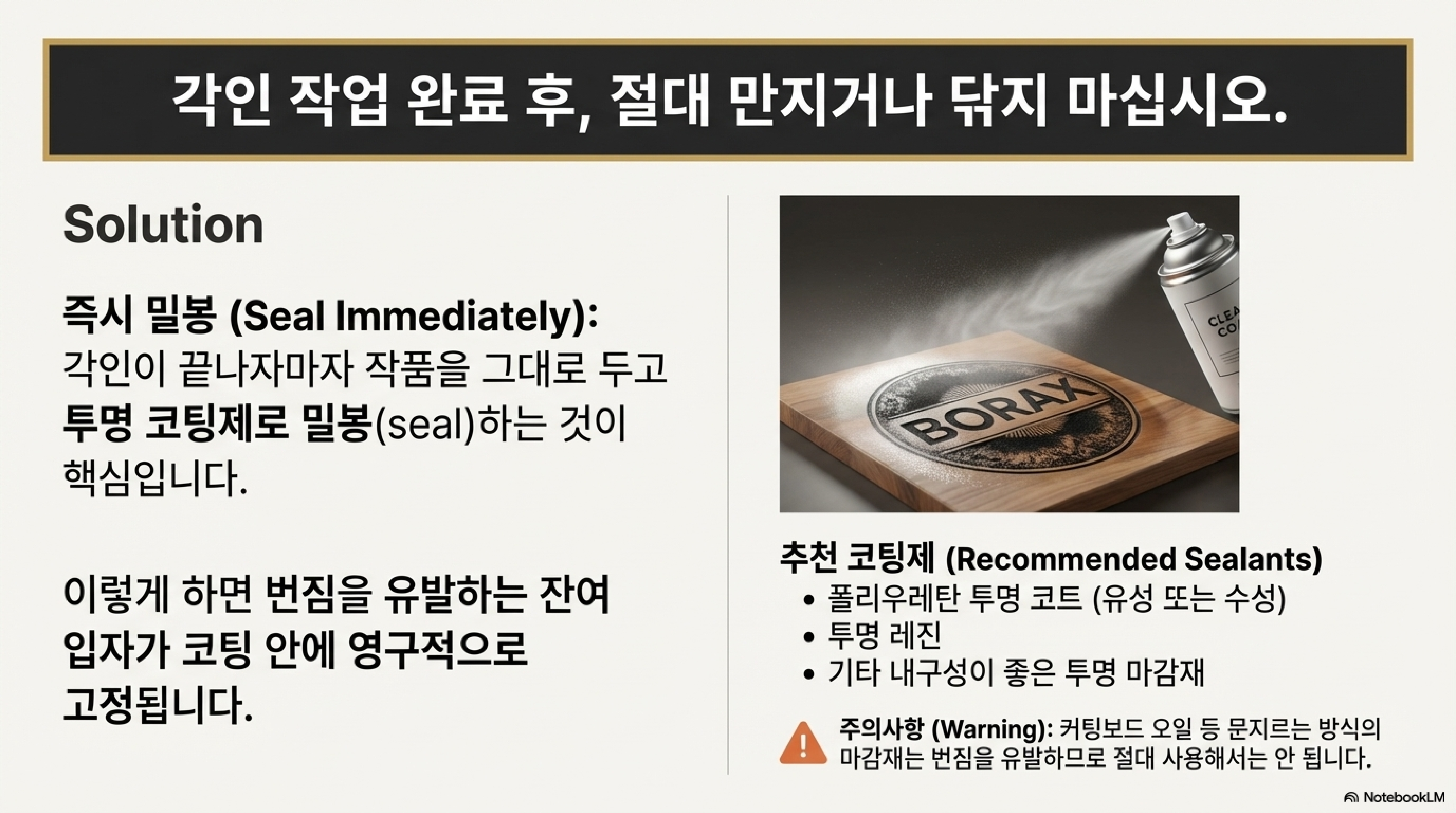하지만 걱정 마세요. 완벽하고 간단한 해결책이 있습니다. 핵심은 각인 작업이 끝난 직후, 절대로 표면을 닦거나 만지지 않는 것입니다. 그 상태 그대로 즉시 투명 마감재로 표면을 밀봉하는 것이죠. 스프레이 타입의 유성 또는 수성 폴리우레탄이나 투명 레진을 사용하여 표면을 코팅하면, 번짐 현상을 효과적으로 방지하고 깊은 검은색을 영구적으로 보존할 수 있습니다. 한 가지 중요한 팁은, 도마용 오일처럼 문질러서 바르는 마감재는 각인을 번지게 할 수 있으므로 절대 사용하면 안 된다는 점입니다.