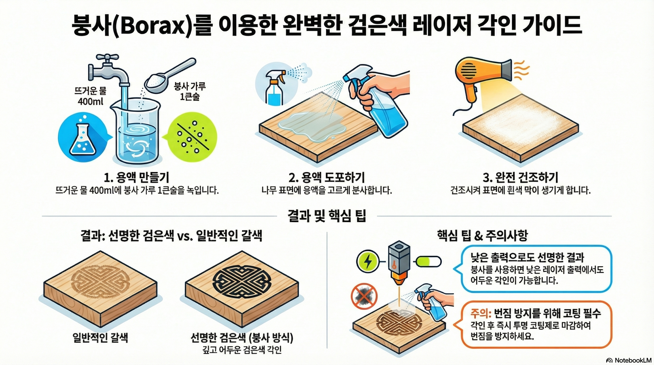 이 기법을 이야기할 때 '번짐' 문제를 빼놓을 수 없습니다. 하지만 이는 붕사 기법만의 단점이라기보다는, 레이저 각인 시 고려해야 할 공통적인 현상에 가깝습니다. 특히 출력을 높여 깊게 각인하면 어떤 방식이든 탄화된 잔여물 때문에 번짐이 발생할 수 있습니다.