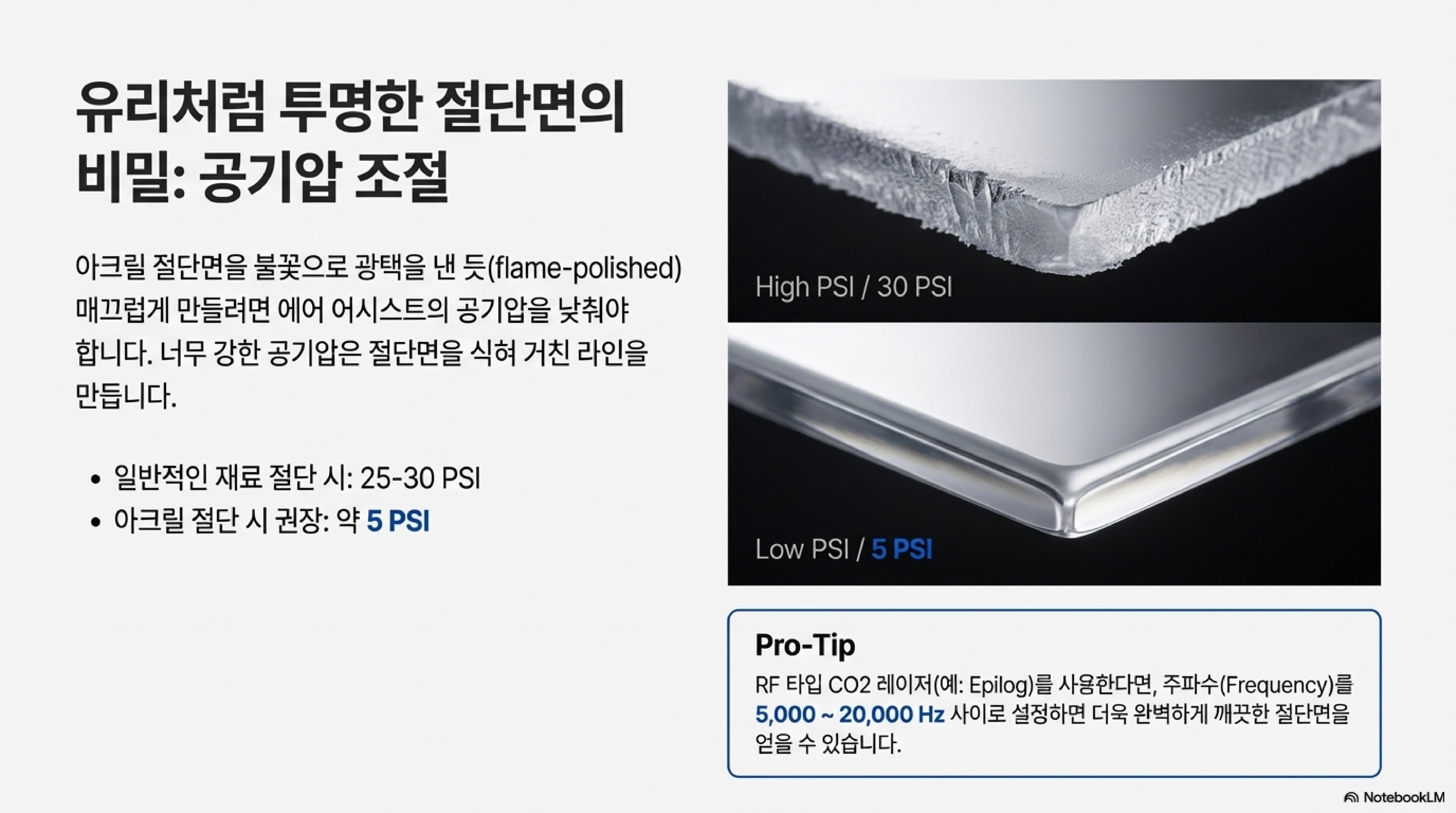 전문가 팁 1: 유리처럼 투명한 절단면의 비밀은 '낮은' 공기압