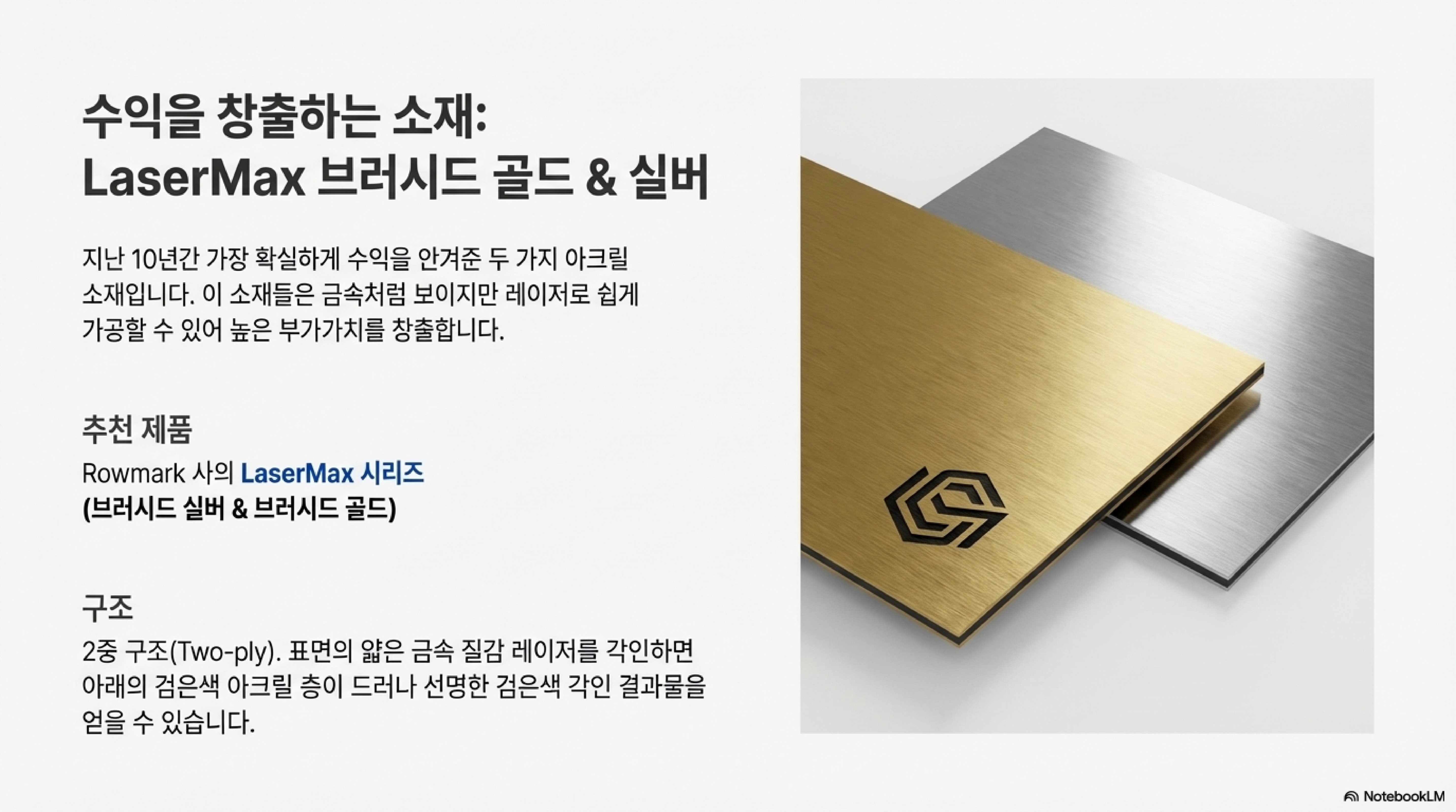 이 소재는 표면에 브러시드 실버나 골드처럼 진짜 금속 질감을 가진 얇은 층이 있고, 그 바로 아래에 검은색 아크릴 층이 있는 구조입니다. 레이저로 표면을 각인하면 금속 질감 층이 벗겨지면서 아래의 검은색이 드러나, 마치 금속에 검은색 글씨를 새긴 듯한 고급스러운 결과물을 손쉽게 만들 수 있습니다.