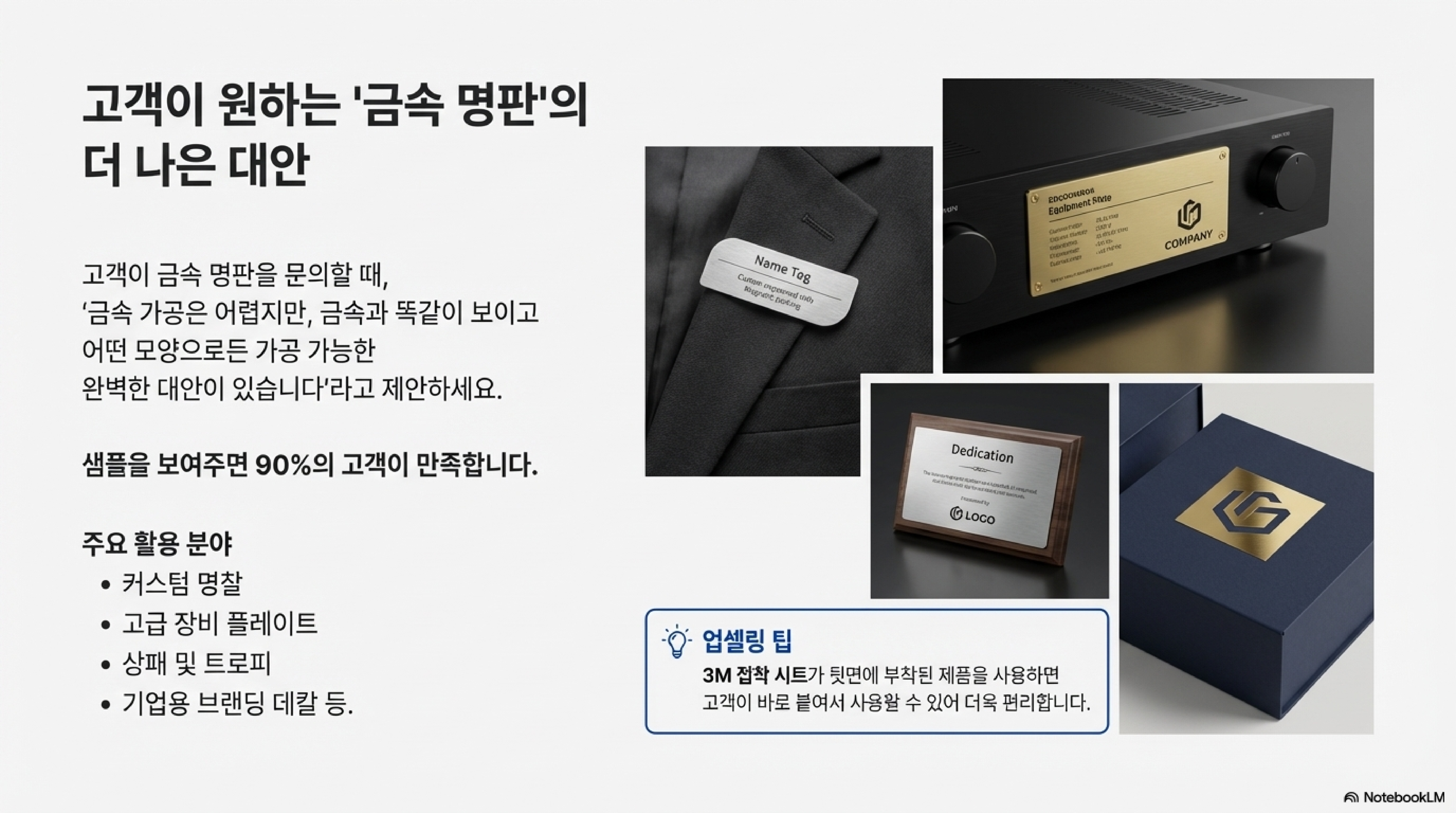 실제 금속을 원하는 고객에게 이 소재 샘플을 보여주며 대안으로 제시했을 때, 제 경험상 10번 중 9번은(90% of the time) 뛰어난 품질과 합리적인 가격에 만족하며 주문으로 이어졌습니다. 심지어 이 제품은 뒷면에 3M 접착제가 미리 부착된 '필 앤 스틱(peel and stick)' 형태로도 구매할 수 있어, 고객이 트로피나 선물 상자에 직접 붙이기도 매우 편리합니다. 이는 여러분의 비즈니스에 새로운 수익 모델이 될 수 있는 강력한 무기입니다.