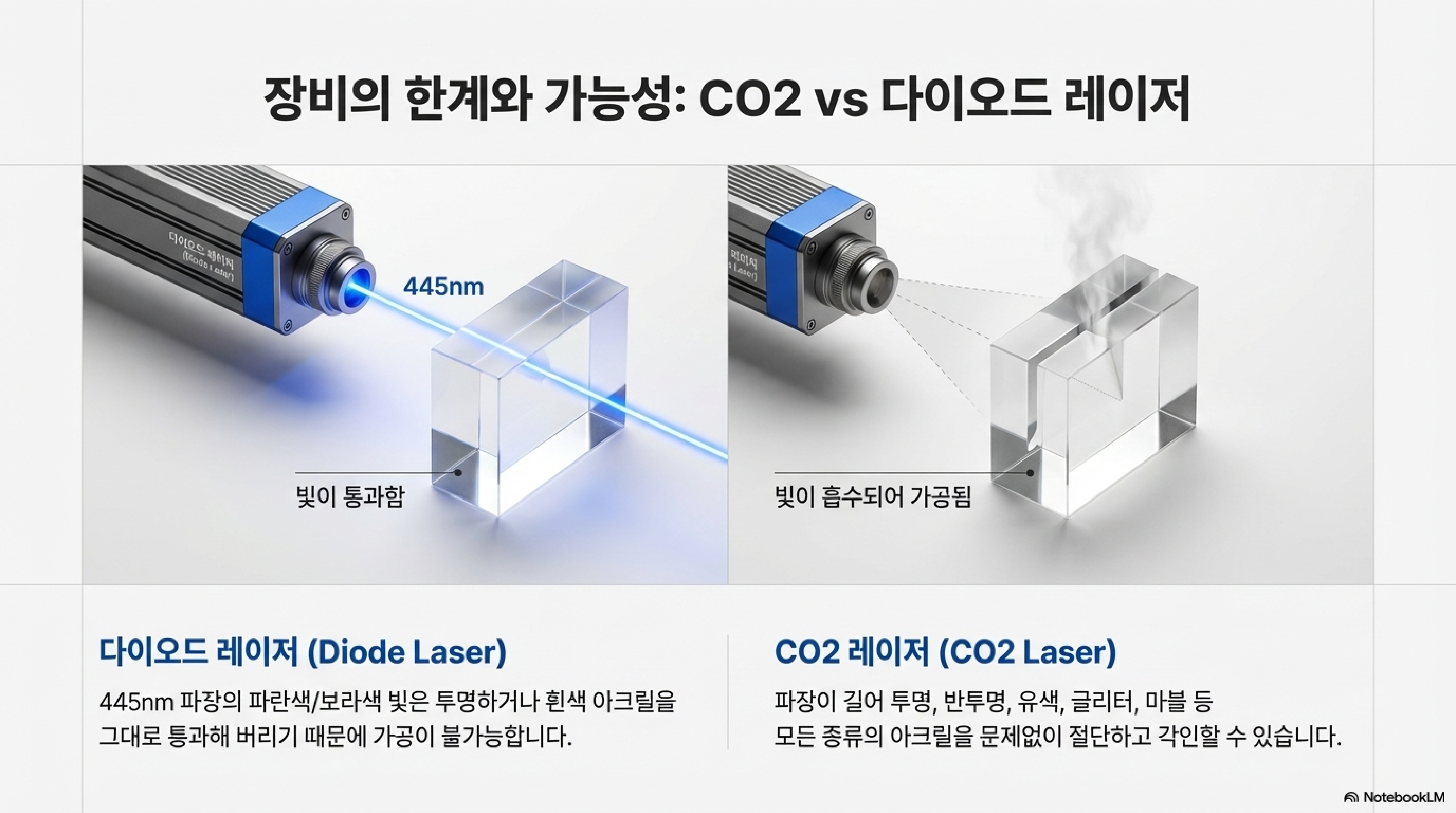 다이오드 레이저(Diode Laser)를 사용하면서 투명 아크릴이 잘리지 않아 당황한 적이 있으신가요? 이는 기계 고장이 아닙니다. 여기에는 명확한 과학적 원리가 숨어 있습니다.