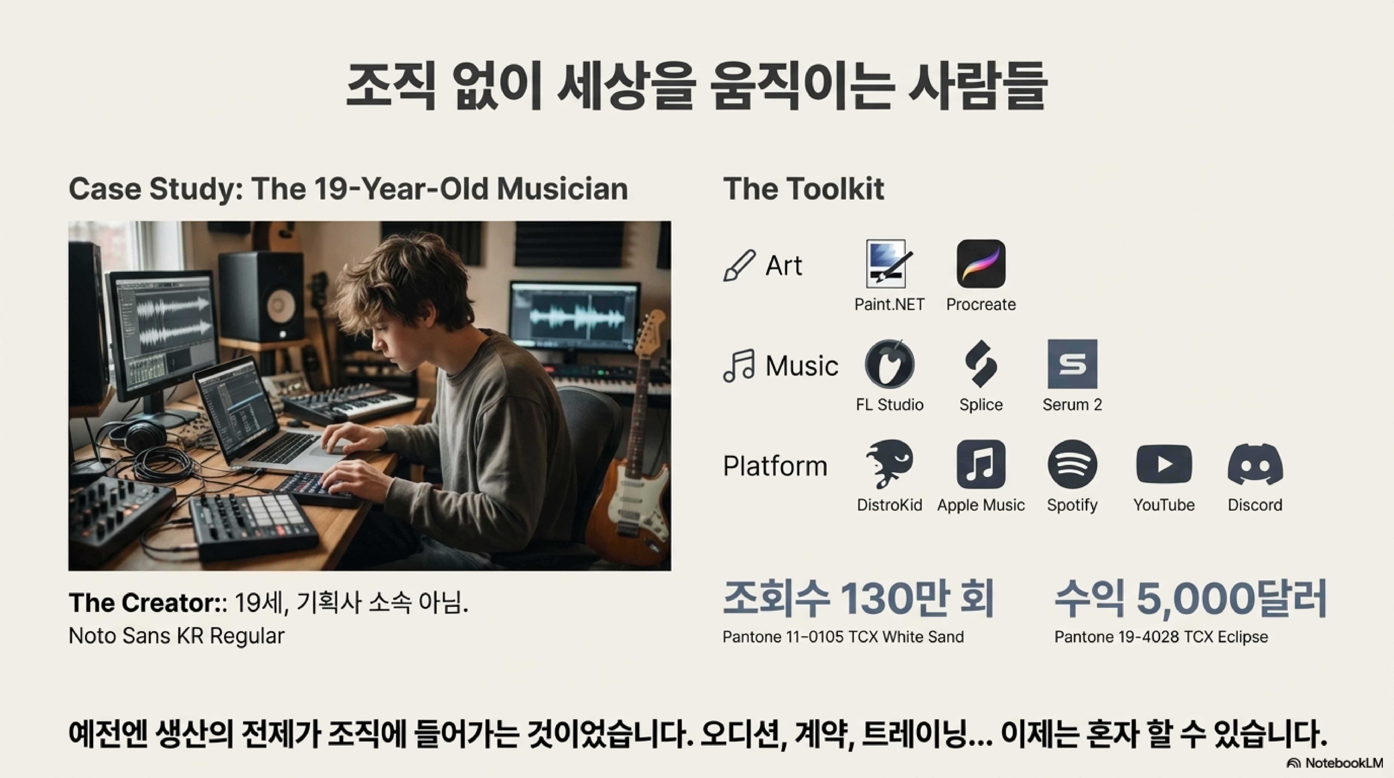 - 음악 산업: 19세 소년은 값비싼 장비나 기획사의 도움 없이 FL 스튜디오, 디스트로키드 같은 저렴한 툴만으로 직접 작곡, 프로듀싱, 글로벌 음원 유통까지 해내 5,000달러(약 650만 원) 이상의 수익을 올렸습니다. 이 사례의 핵심은 단순한 성공 신화가 아닙니다. 과거 거대 기획사가 독점했던 '제작'과 '글로벌 유통'의 권력이 개인에게 완전히 넘어왔음을 의미하는, 생산 수단의 민주화입니다.