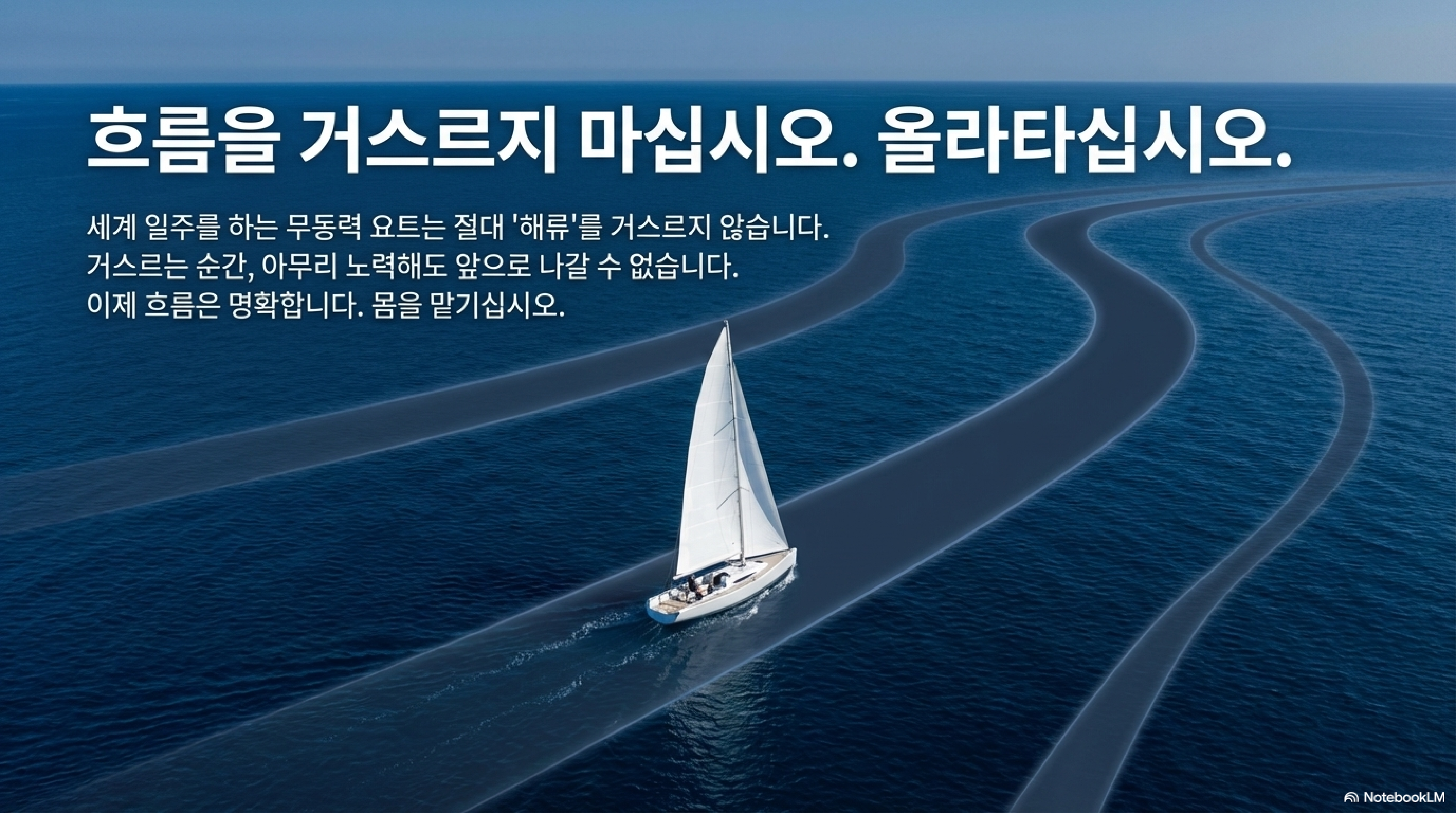 이 거대한 변화 앞에서 우리가 취해야 할 단 하나의 원칙은 무엇일까요? 송길영 박사는 단호하게 말합니다. 저항하지 말고, 흐름에 올라타라고 말입니다. 그는 이 변화를 거스를 수 없는 '해류(ocean current)'에 비유합니다. 해류를 거슬러 노를 젓는 것은 무의미한 노력일 뿐입니다. 흐름에 몸을 맡기고 그 위에서 나아갈 방향을 찾아야 합니다.