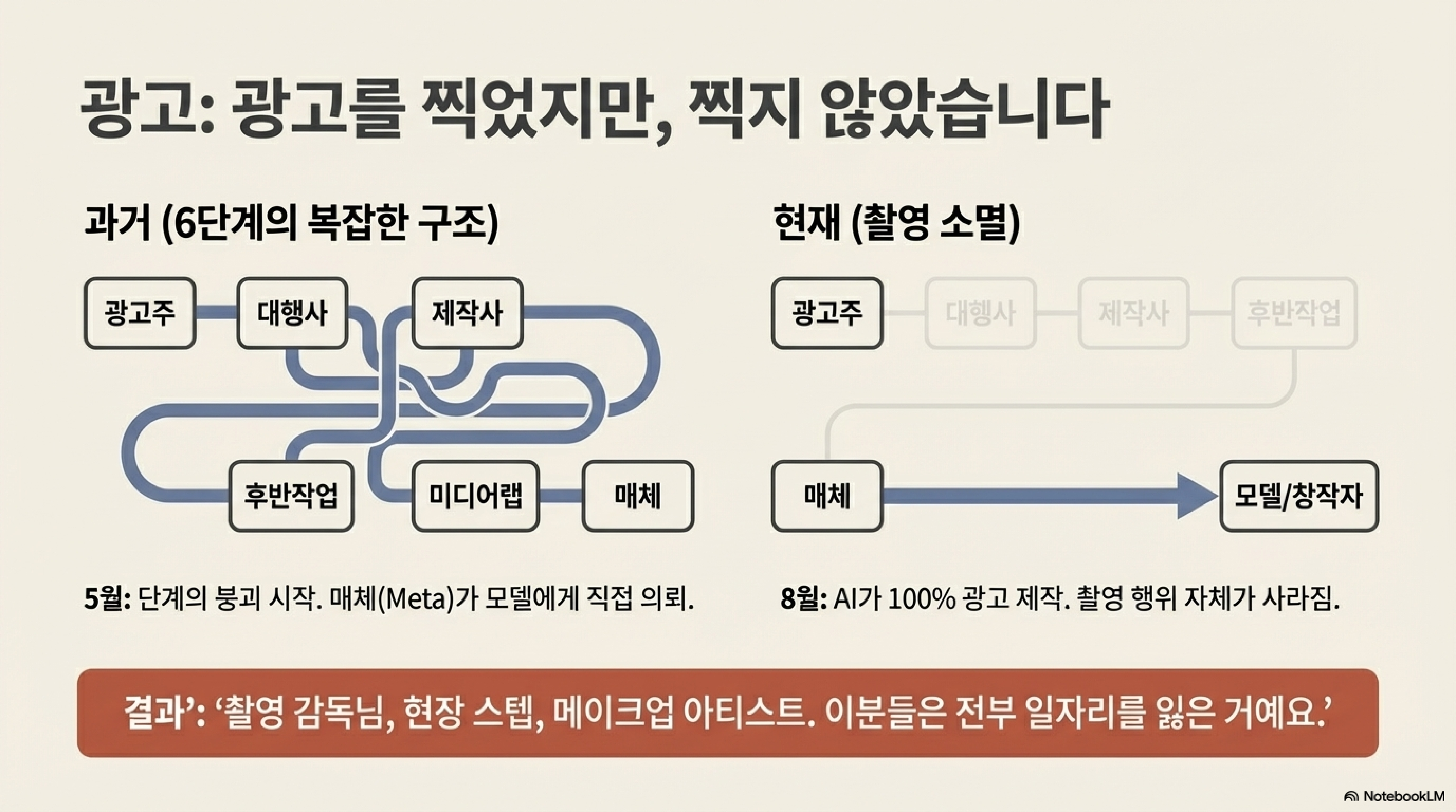 가장 생생한 사례는 광고 제작 과정입니다. 과거 광고 하나를 만들기 위해서는 광고주, 광고 대행사, 제작사, 후반 작업 업체, 매체사 등 최소 6단계 이상의 복잡한 과정을 거쳐야 했습니다. 하지만 방송인 노홍철 씨의 사례는 이 모든 공식을 파괴했습니다. 페이스북과 인스타그램을 운영하는 '메타'가 직접 노홍철 씨에게 광고를 제안한 것입니다. 매체였던 메타가 AI를 이용해 고객을 분석하고, 광고를 제작하고, 플랫폼에 송출한 뒤 결과 보고까지 모든 단계를 단독으로 처리했습니다.