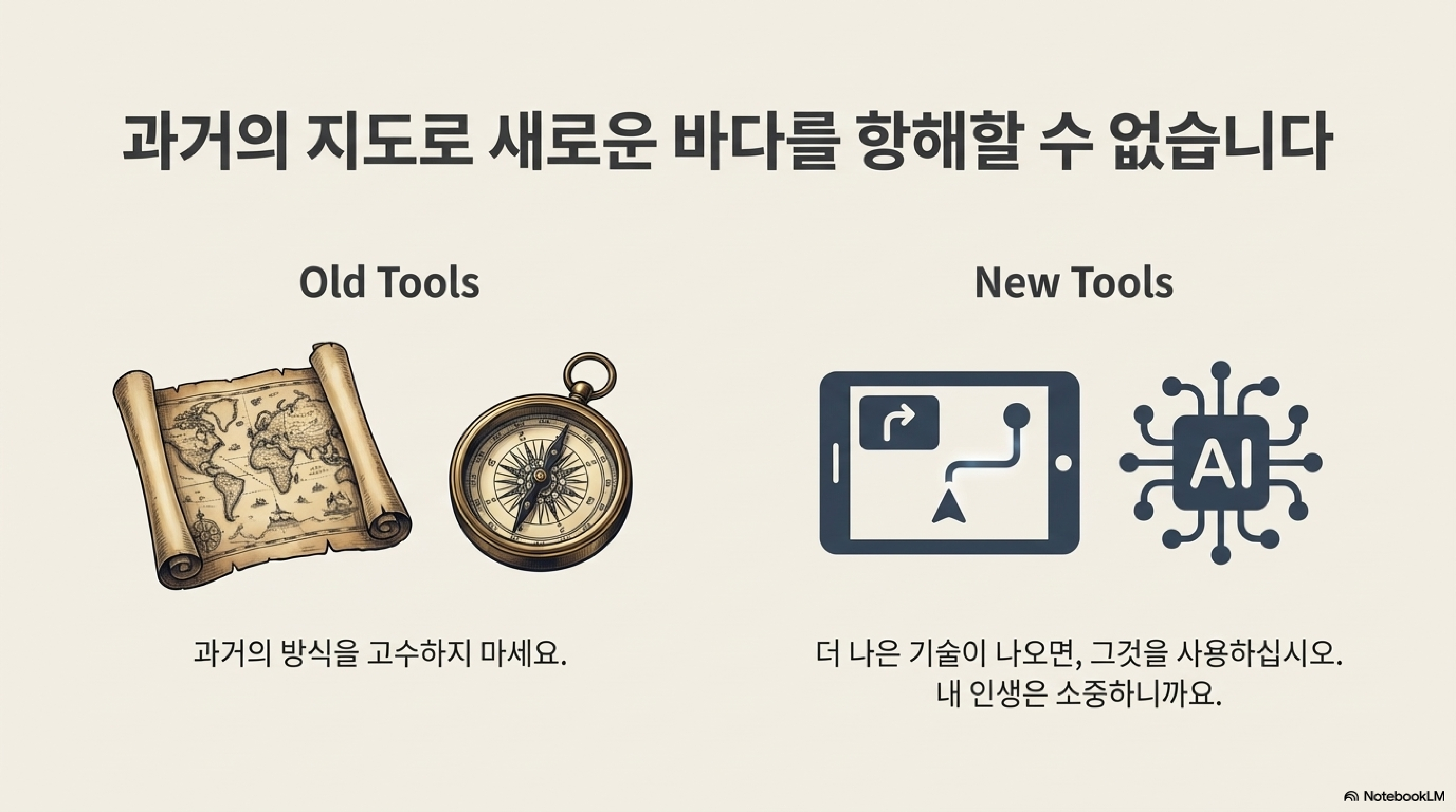 항해에 필요한 '해도'와 '나침반'이 아무리 훌륭해도, 'GPS'라는 더 뛰어난 기술이 나왔다면 당연히 그것을 써야 합니다. 예전 방식을 고집하는 것은 어리석은 일입니다. 여기서 GPS가 바로 AI입니다.