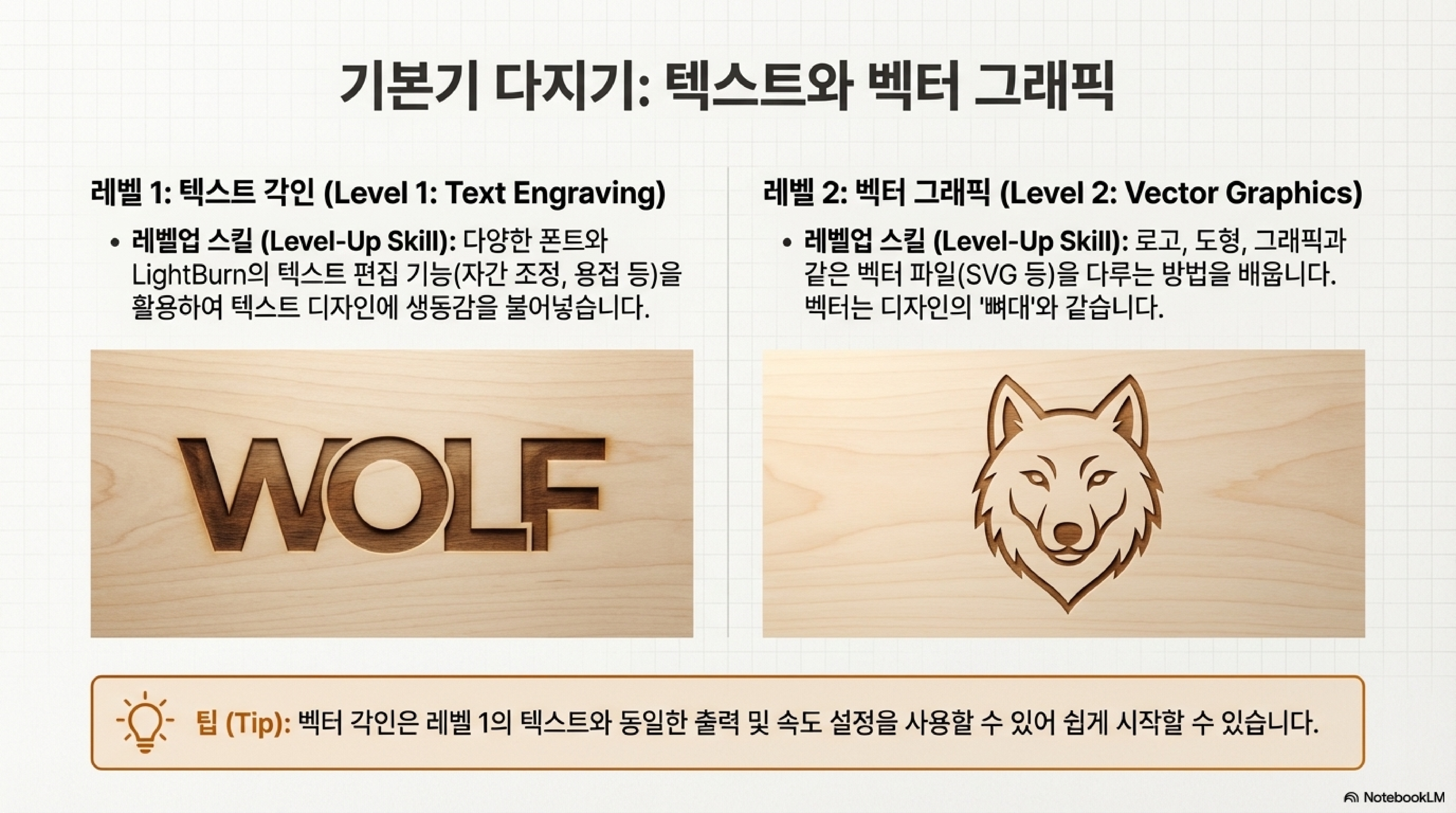 대부분의 사용자는 텍스트(Level 1)나 간단한 벡터 그래픽(Level 2) 각인에서 시작합니다. 물론 이것만으로도 훌륭한 작품을 만들 수 있지만, 거기서 멈출 필요는 없습니다. 이 글에서는 그 단계를 넘어 당신의 작품을 진정으로 돋보이게 만들 몇 가지 핵심적인 '레벨 업' 비법을 소개합니다. 단 하나의 새로운 기술을 추가하는 것만으로도 당신의 작품은 눈에 띄게 달라질 수 있습니다.