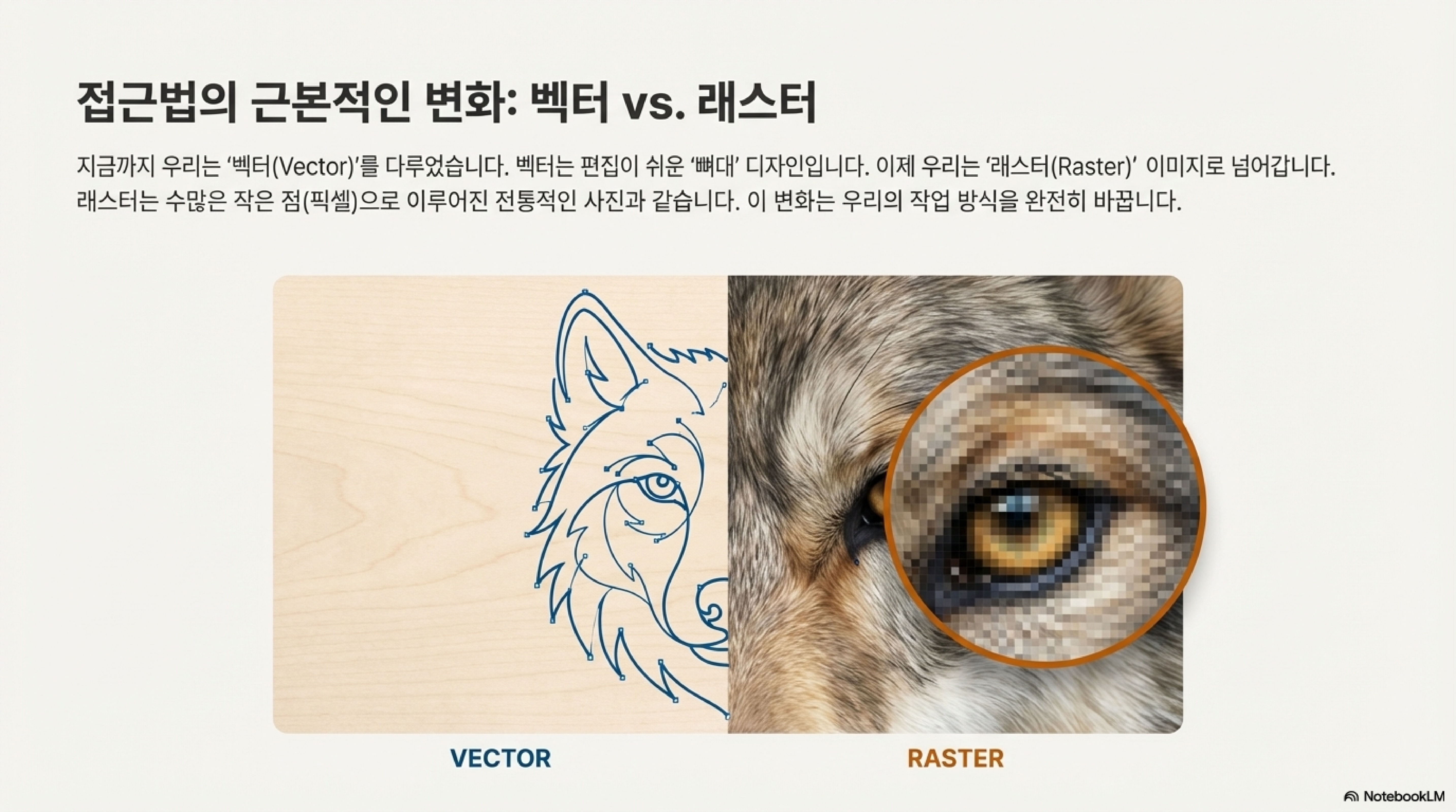 지금까지 다룬 각인은 모두 벡터(vector) 기반입니다. 벡터는 일종의 '뼈대 디자인'으로, 다루기 쉽습니다. 하지만 우리가 사진이라고 부르는 이미지는 래스터(raster) 기반이며, 이는 수많은 작은 점, 즉 픽셀로 이루어져 있습니다. 벡터 각인에서 래스터 각인으로 넘어가는 것은 접근 방식이 근본적으로 바뀌어야 함을 의미합니다.