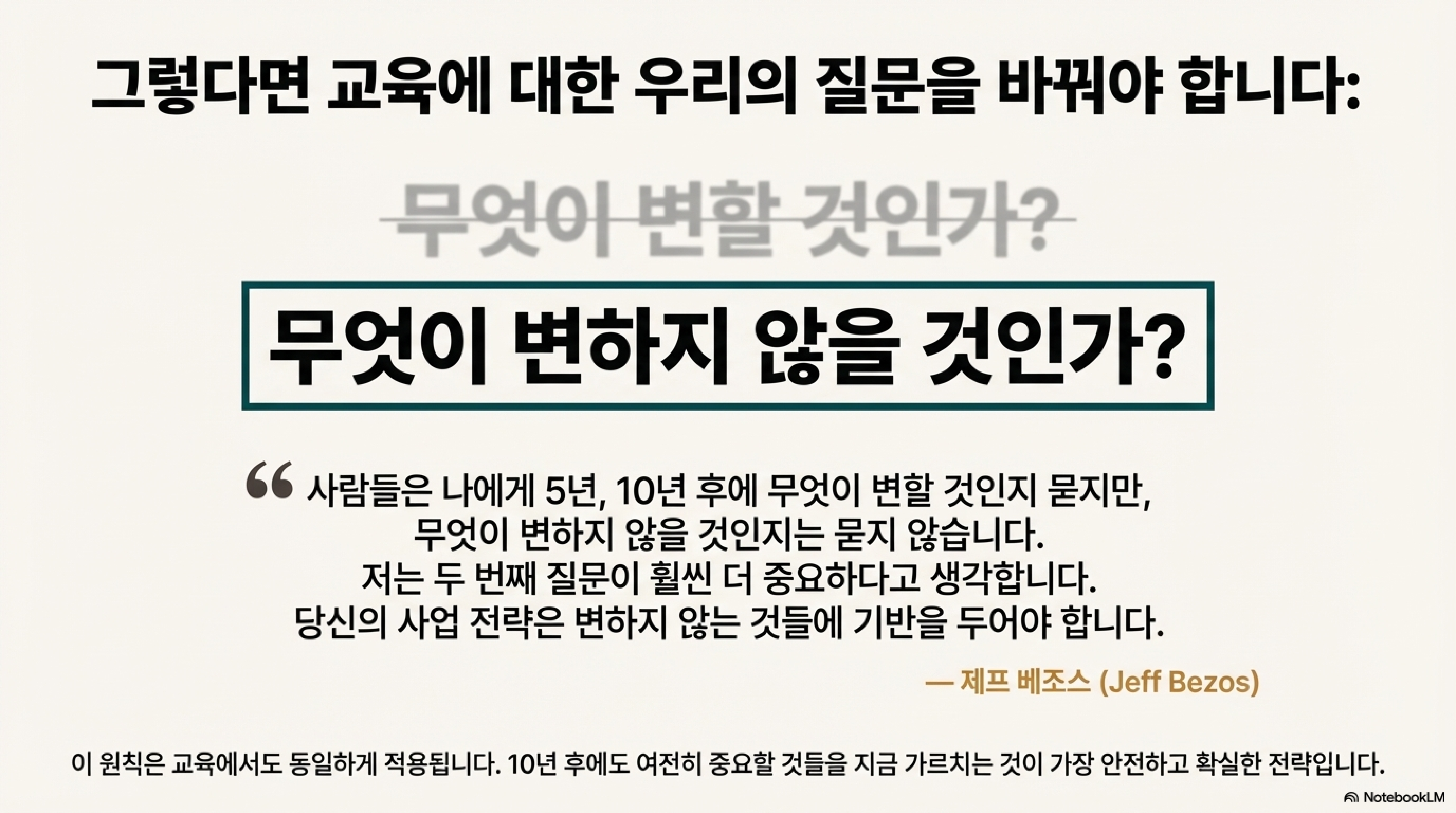 "사람들은 나에게 5년 후나 10년 후에 무엇이 변할 것인지 묻지만, 무엇이 변하지 않을 것인지는 묻지 않습니다. 저는 두 번째 질문이 사실 더 중요하다고 생각합니다."