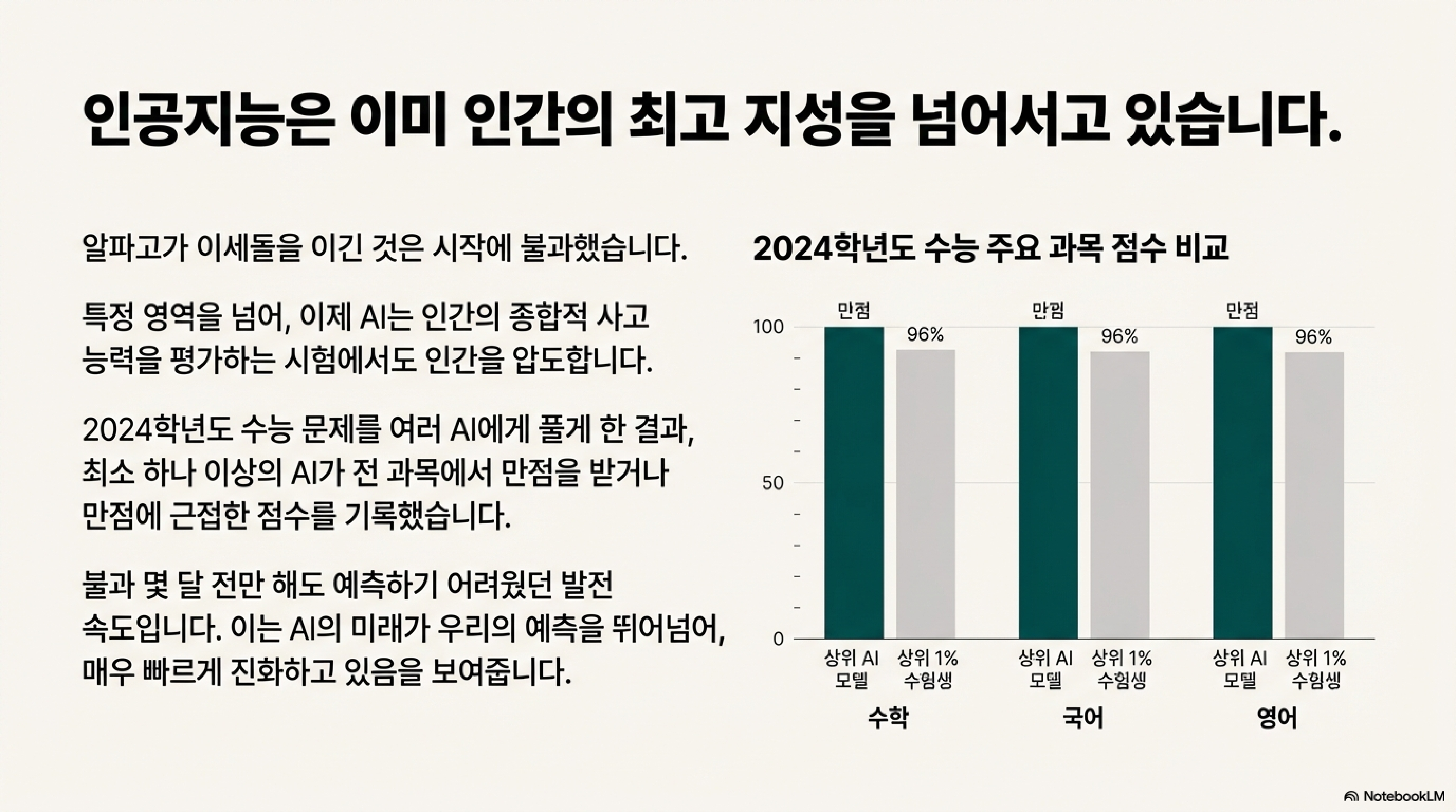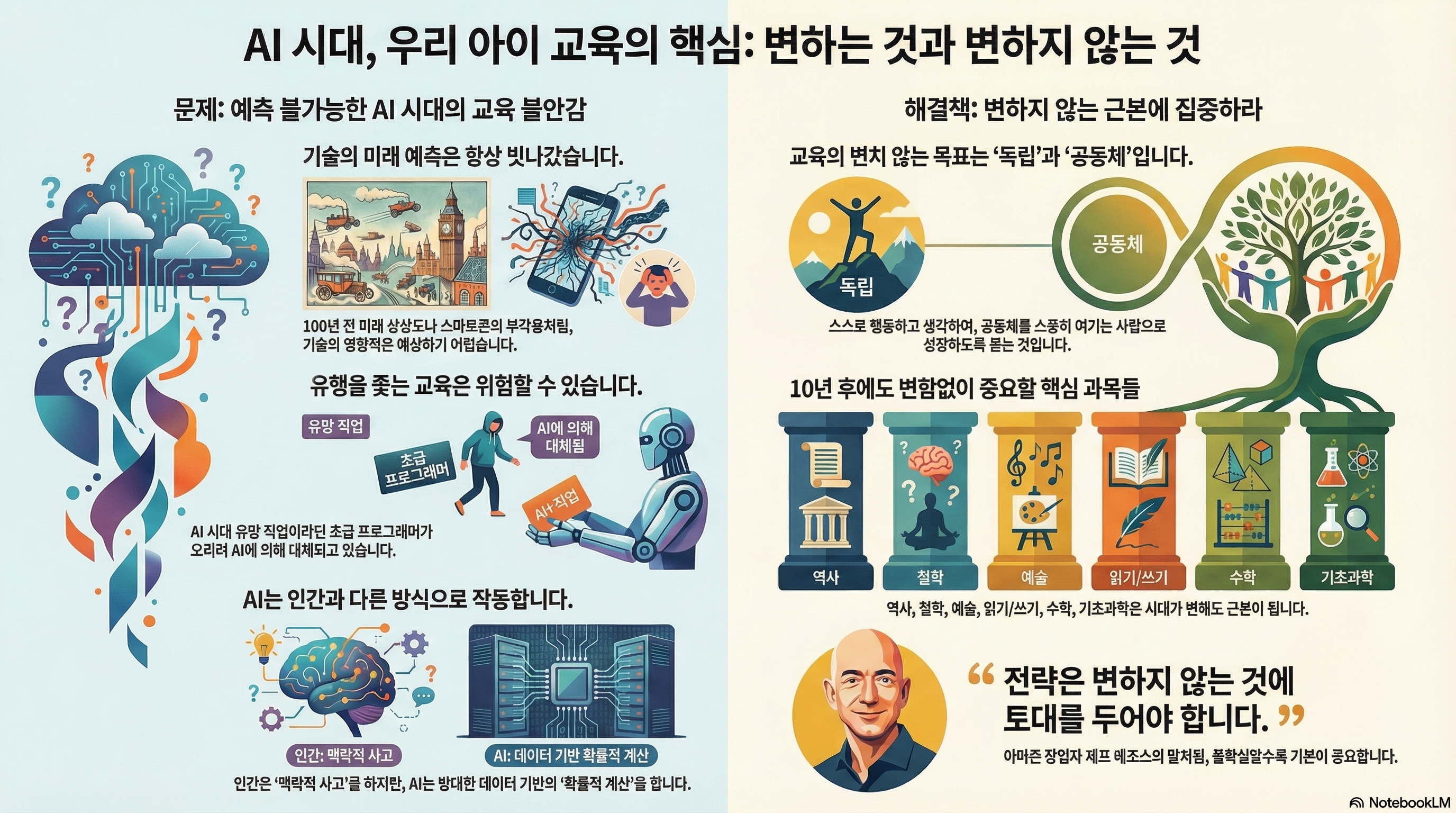 인공지능이 수능 만점을 받고, 그림을 그리고, 코딩까지 해내는 시대. 부모와 교육자들의 마음속에는 불안감이 커져만 갑니다. "AI가 모든 것을 대체할지도 모르는 세상에서, 우리는 아이들에게 무엇을 가르쳐야 할까?" 이 질문에 대한 답을 찾기 위해 모두가 미래의 변화를 예측하려 애쓰고 있습니다.