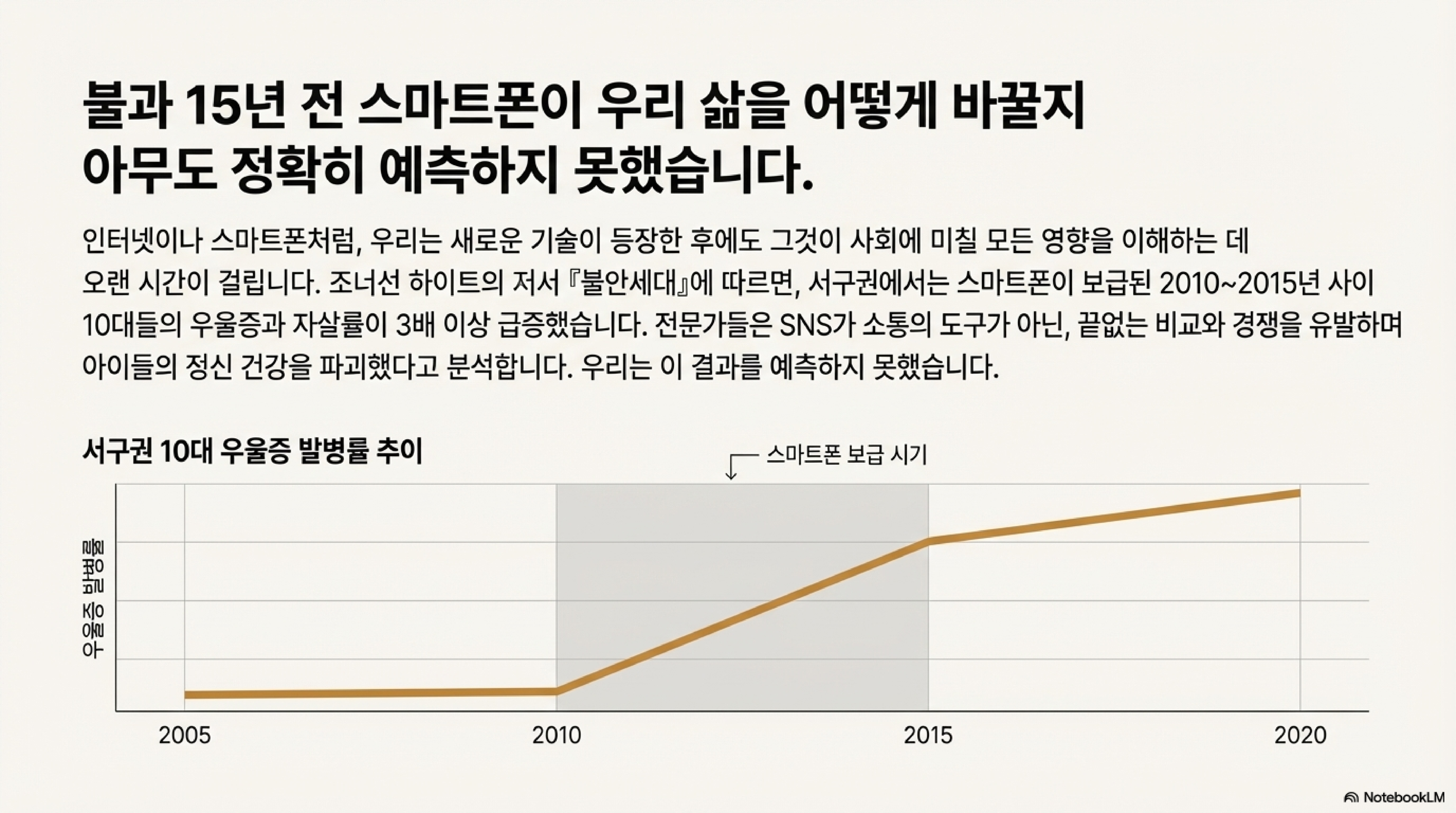 - 스마트폰의 그림자: 불과 십수 년 전 등장한 스마트폰조차 우리는 완전히 이해하지 못하고 있습니다. 조너선 하이트의 연구에 따르면, 스마트폰과 SNS가 보급된 2010년 이후 서구 청소년들의 우울증과 자살률이 급증했습니다. 하지만 김 교수는 충격적인 후속 이야기를 전합니다. 하이트 교수가 ‘왜 한국은 통계적 급증이 보이지 않는가?’라는 질문에 답한 내용입니다. 아내가 한국인인 그는 단호하게 말했습니다. 한국 학생들의 정신 건강은 학업 스트레스로 인해 이미 **전 세계 최악의 상태(최악의 상태)**였기 때문에, 스마트폰의 부정적 영향이 통계적으로 드러나지 않을 정도였다는 것입니다. 이 일화는 우리가 섣부른 기술 도입을 논하기 전에 아이들이 처한 현실을 먼저 직시해야 함을 경고합니다.