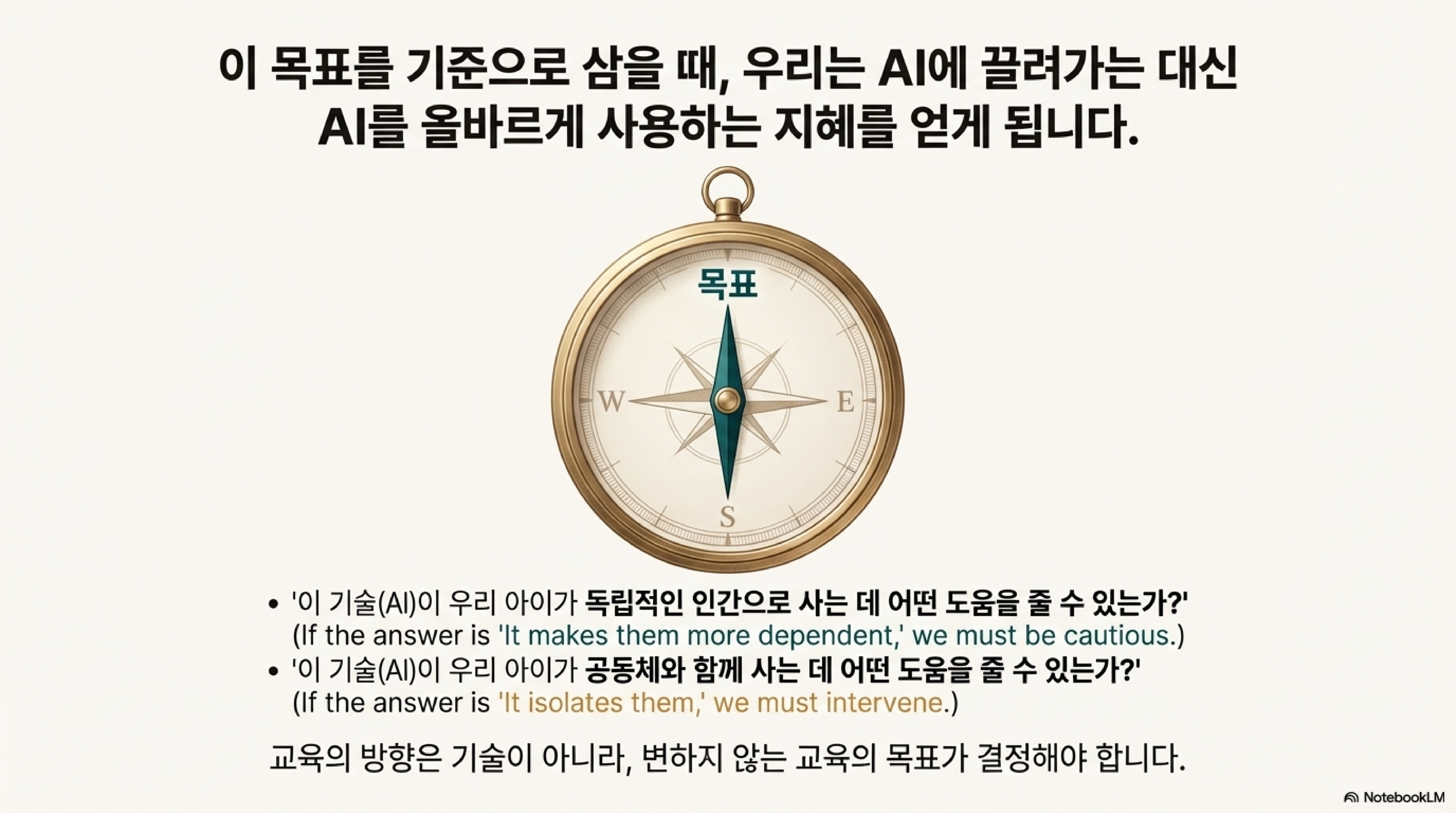 이러한 관점에서 보면 AI에 대한 우리의 질문은 완전히 달라져야 합니다. "AI를 어떻게 활용할 것인가?"가 아니라, **"우리 아이가 독립적인 개인으로서 공동체에 기여하는 사람으로 성장하는 데 AI를 어떻게 활용할 수 있을까?"**라고 물어야 합니다. 이 질문은 AI를 정답을 찾아주는 만능 해결사로 만들어 아이를 의존적으로 만드는 것이 아니라, 아이 스스로 자신의 역량을 키워나가는 데 AI를 유용한 '도구'로 사용하도록 방향을 설정해 줍니다.