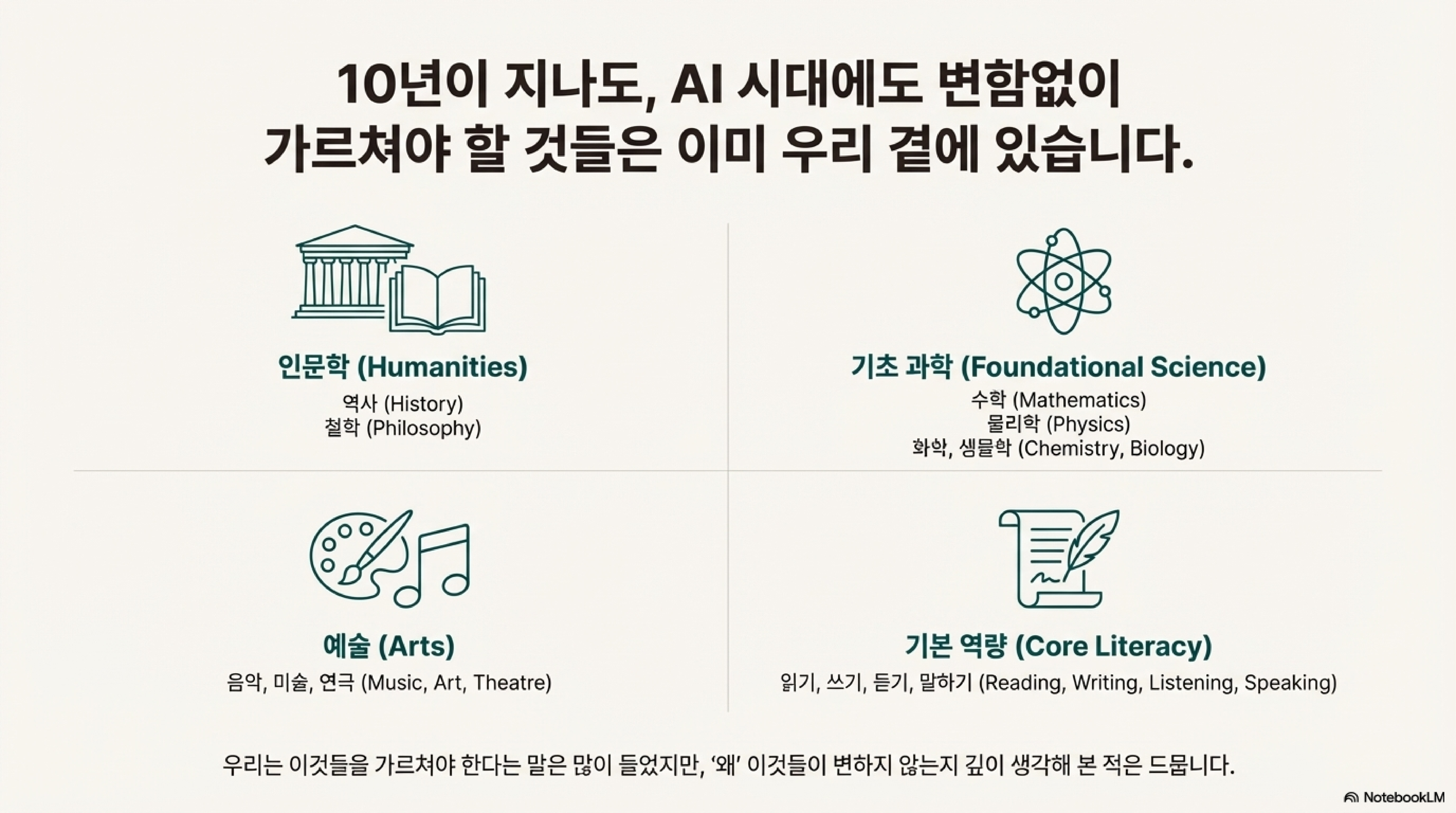 AI 시대를 대비하는 최고의 방법은 최신 기술이나 유행하는 코딩 교육을 맹목적으로 쫓는 것이 아닙니다. 오히려 기술 변화에도 흔들리지 않을 인류의 지혜와 지식을 깊이 있게 가르치고, 교육의 근본 목표를 재확인하는 것입니다.