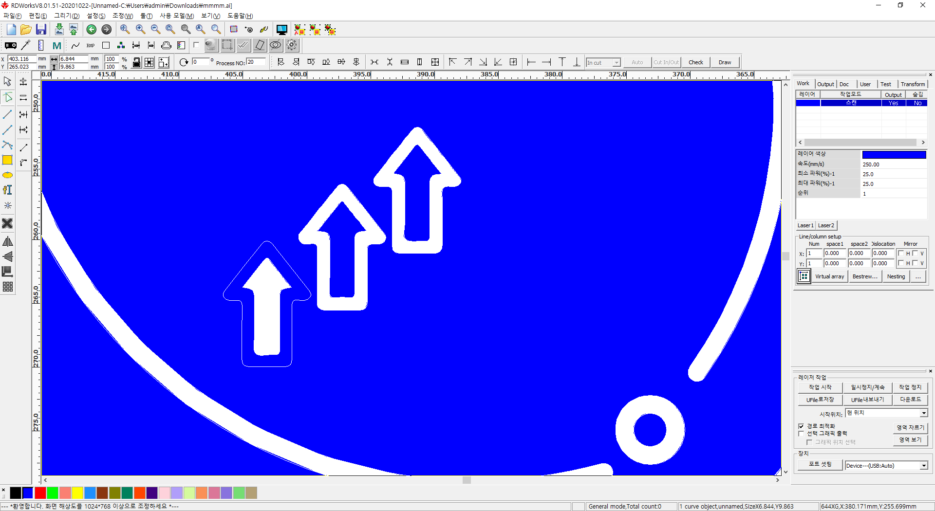 도면을 RDWorks에서 불러온 경우 아래 그림의 왼쪽 화살표처럼 각인이 안되는 경우가 있다. 이 경우의 대처법은 아래와 같다.