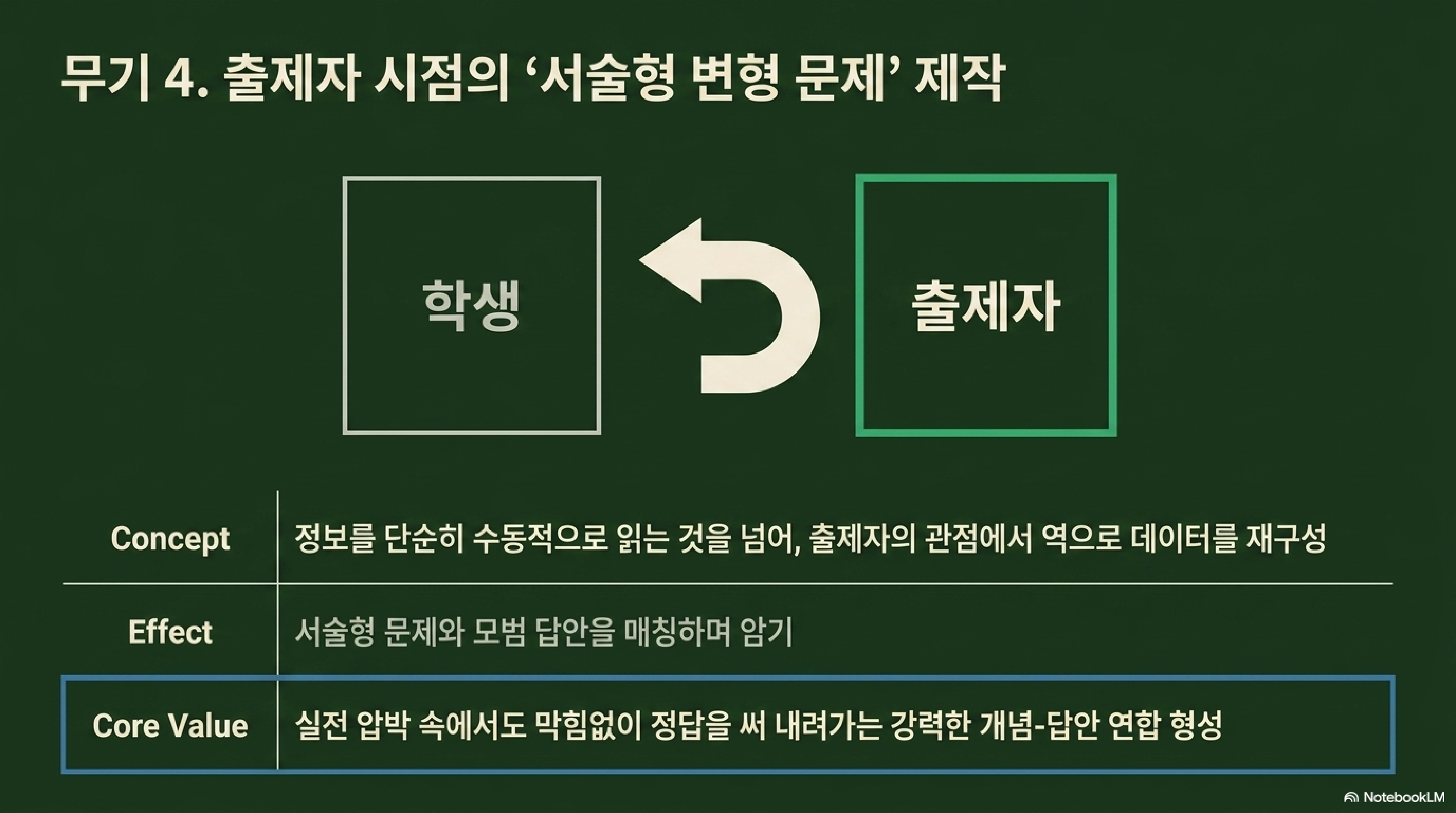 * 보고서용 프롬프트: "정답이 정답인 이유뿐만 아니라, 오답 선지 4개가 각각 '왜 틀렸는지'를 소스 자료의 개념에 근거하여 하나하나 명확하게 반박하는 분석 보고서를 작성해 줘. 학생들이 선지의 함정을 판별하는 능력을 기를 수 있도록 작성해 줘."