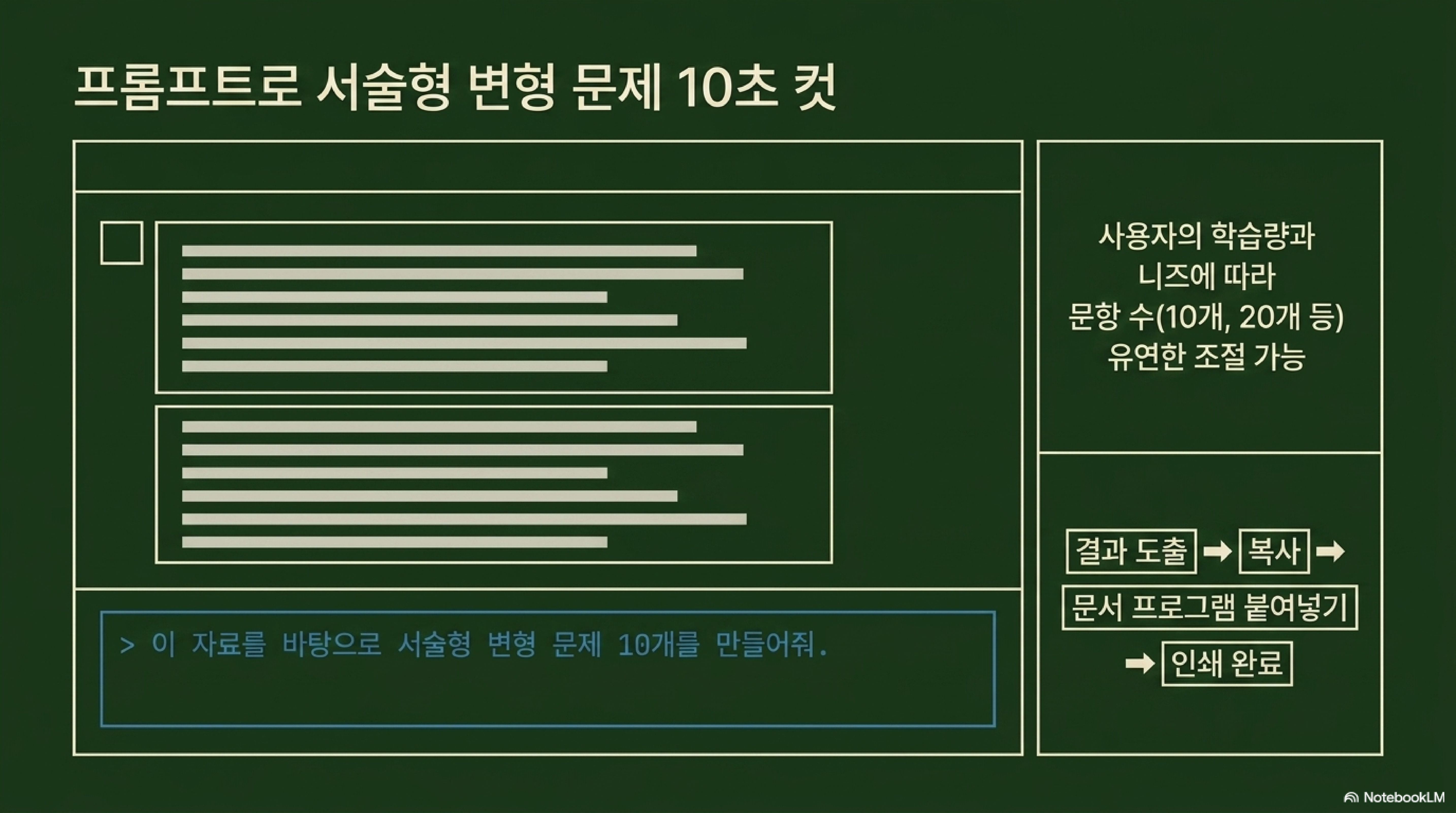 * 보고서용 프롬프트: "단순한 요약을 넘어, 이 사회 현상이 발생하게 된 배경, 진행 과정, 그리고 사회에 미치는 긍정적/부정적 영향을 다각도로 분석하는 보고서를 작성해 줘. 사진, 그래프, 도표, 지도, 연표 등 이미지 자료가 어떤 의미를 지니는지 최대한 자세히 설명해 줘. 시험 직전에 활용할 수 있는 단답형 및 서술형 Q&A 스터디 가이드를 덧붙여 줘."