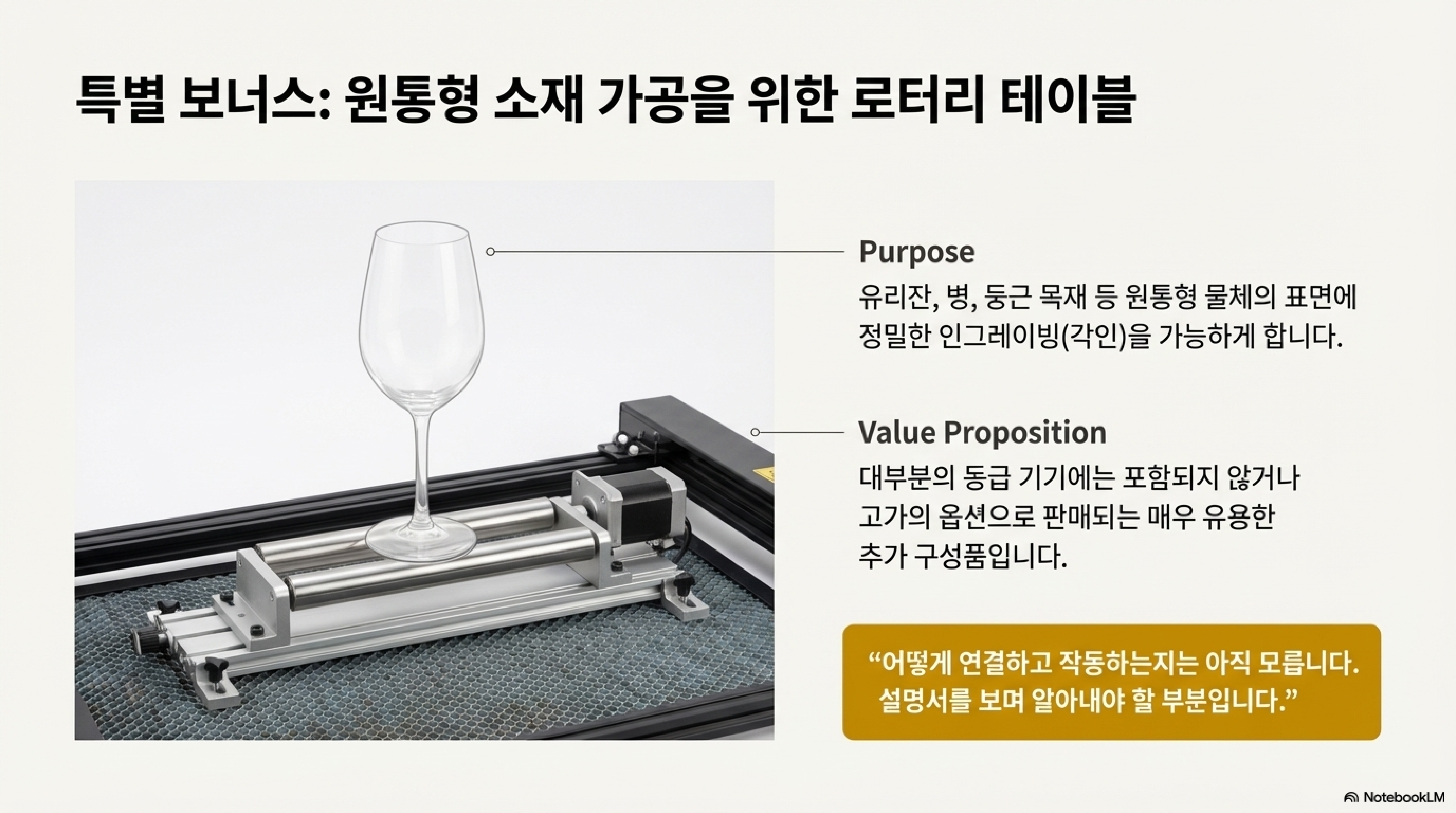 이 레이저 커팅기의 최종 구매가는 부가세 환급 후 단돈 1,000파운드였습니다. 여기서 주목할 점은 이 가격이 단순히 기계 본체 값만은 아니라는 것입니다. 여기에는 CO2 레이저 튜브를 식히기 위한 수냉용 수족관 펌프, 커팅 효율을 높이는 에어 어시스트용 소형 공기 압축기, 심지어 컵이나 병 같은 원통형 재료에 각인할 수 있는 회전 테이블까지 모두 포함되어 있었습니다. 이들은 단순한 '덤'이 아닙니다. 개별적으로 구매하려면 수십만 원의 추가 비용과 호환성 확인이라는 두통을 감수해야 하는 필수 주변기기들입니다. 솔직히 말해, 이 가격에 이 모든 구성품을 중국에서 영국까지 배송받았다는 사실은 업계의 상식을 뒤엎는 수준입니다.