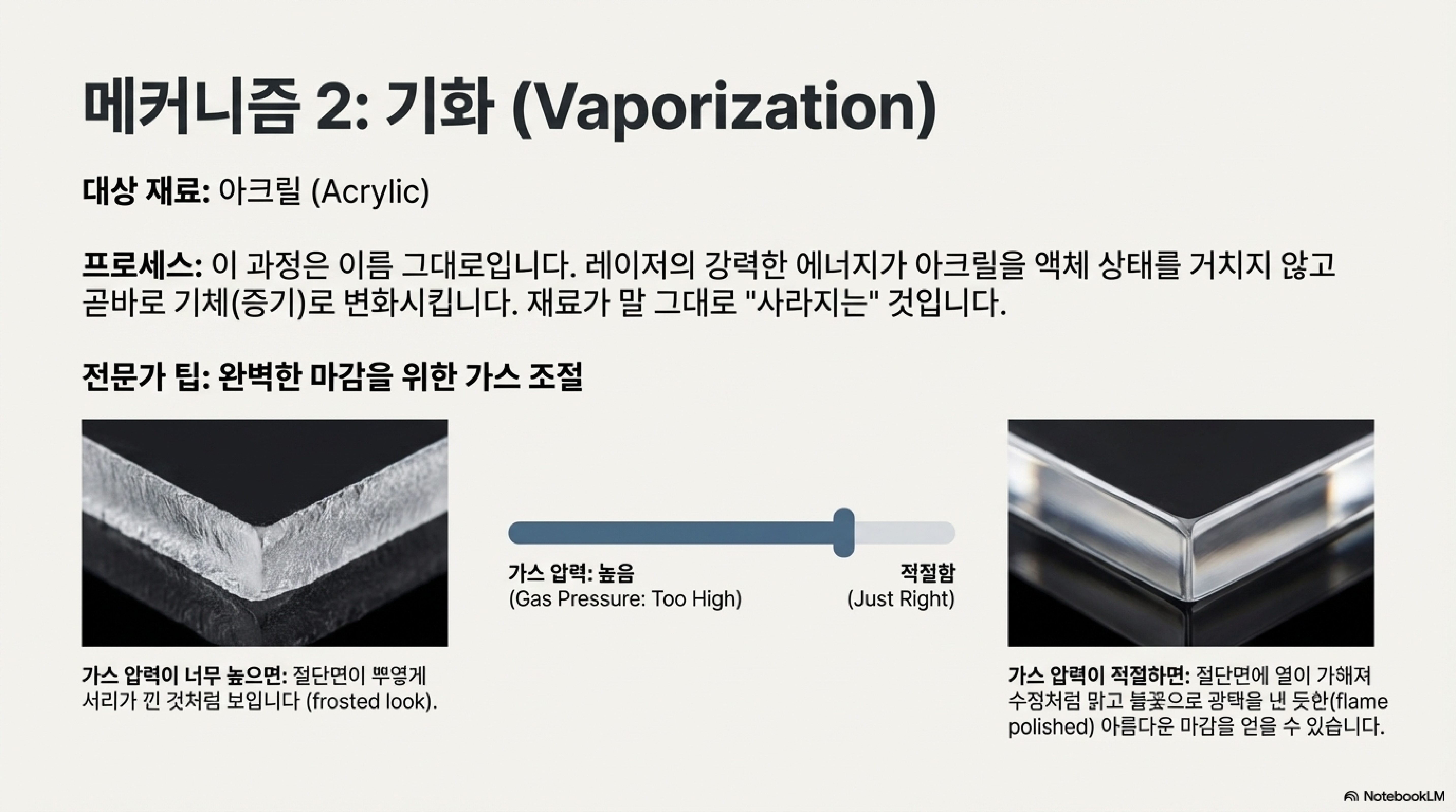 - 기화 (Vaporization): 아크릴 절단 시에만 나타나는 독특한 과정입니다. 레이저 에너지가 닿는 순간, 고체인 아크릴이 즉시 기체로 변해 증발합니다.