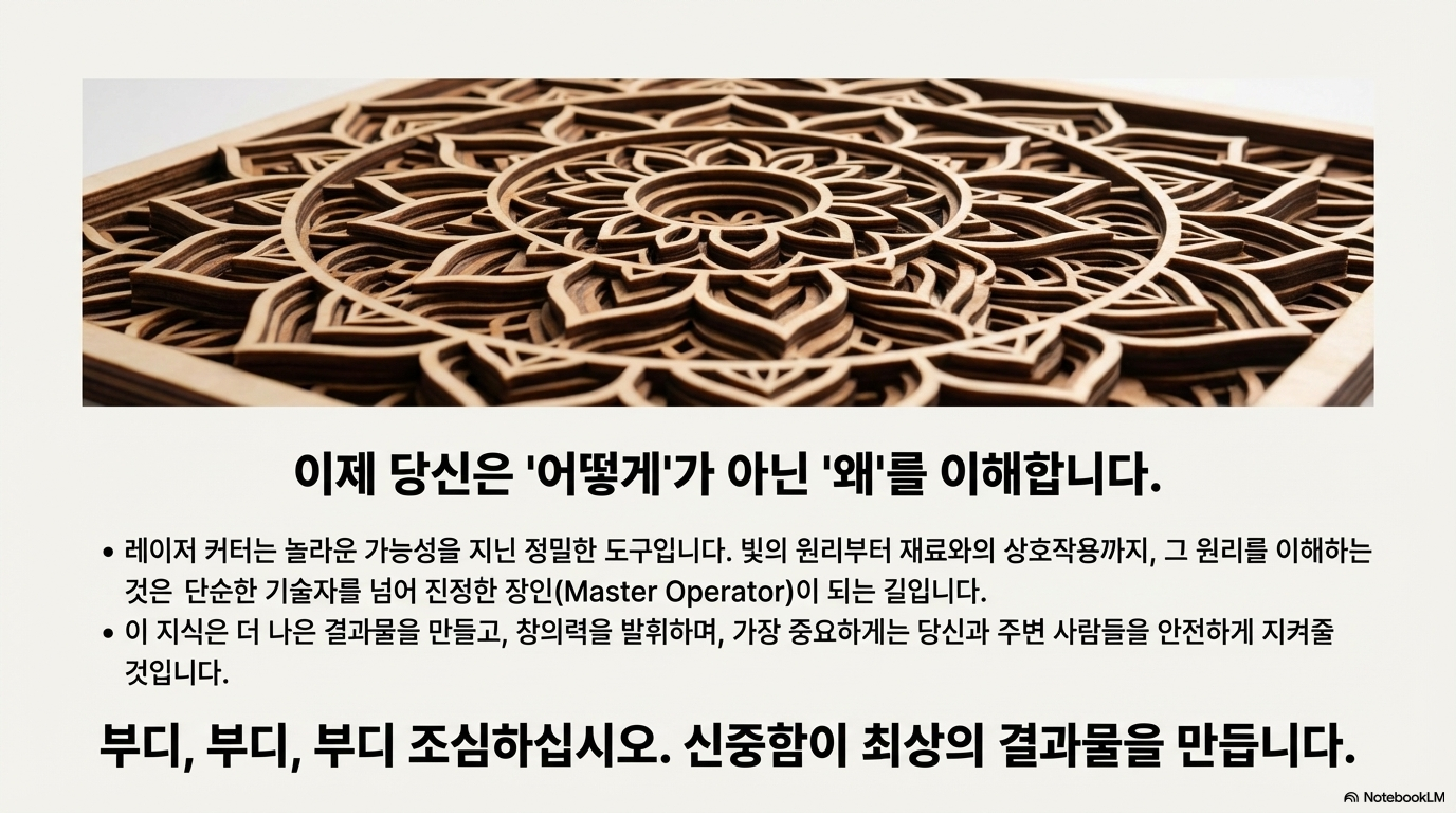 레이저 커터는 장난감이 아니라 정교한 도구입니다. 사용 설명서를 넘어서 이러한 깊이 있는 원리를 이해하는 것은 안전을 지키고 훌륭한 결과물을 얻기 위한 필수적인 과정입니다.