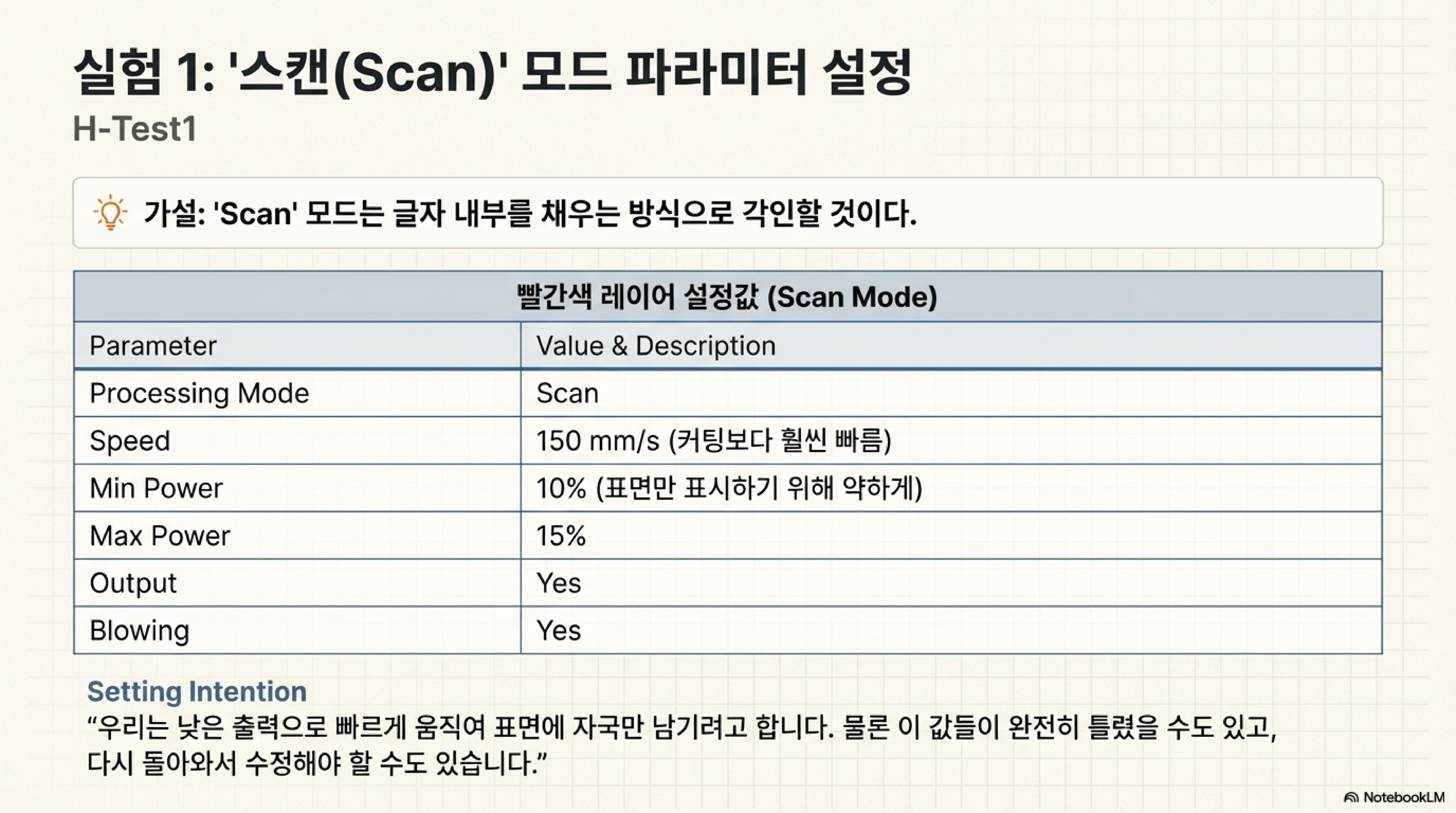 하나의 결과물에 글자를 새기는 작업(에칭)과 외곽선을 잘라내는 작업(컷팅)을 모두 해야 한다면 어떻게 해야 할까요? 해답은 '레이어' 개념에 있었습니다. 각 작업을 별도의 색상 레이어로 구분한 뒤, 소프트웨어에서 그 순서를 지정하는 것입니다. 예를 들어, 우리는 빨간색 레이어는 글자를 새기는 '에칭' 작업으로, 검은색 레이어는 모양을 잘라내는 '컷팅' 작업으로 설정했습니다.