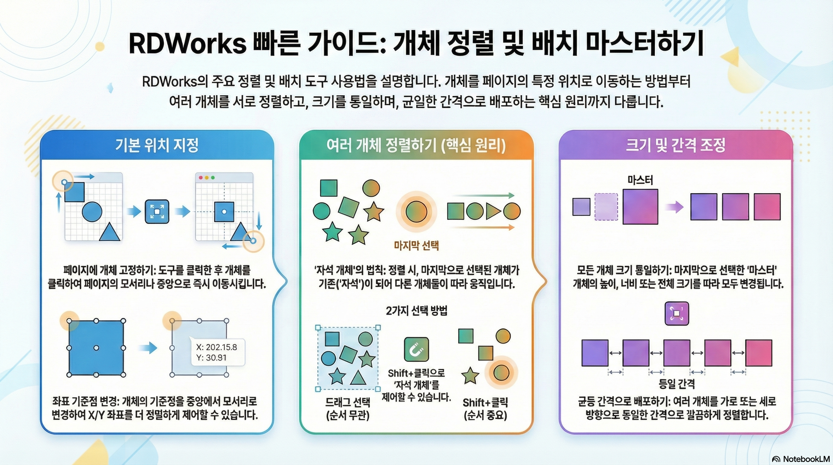 RDWorks 정렬의 핵심은 '어떤 객체가 기준이 되는가'입니다. 기본적으로는 마지막에 그린 객체, Shift 키를 사용하면 마지막에 선택한 객체가 바로 그 기준, 즉 '자석'이 됩니다.