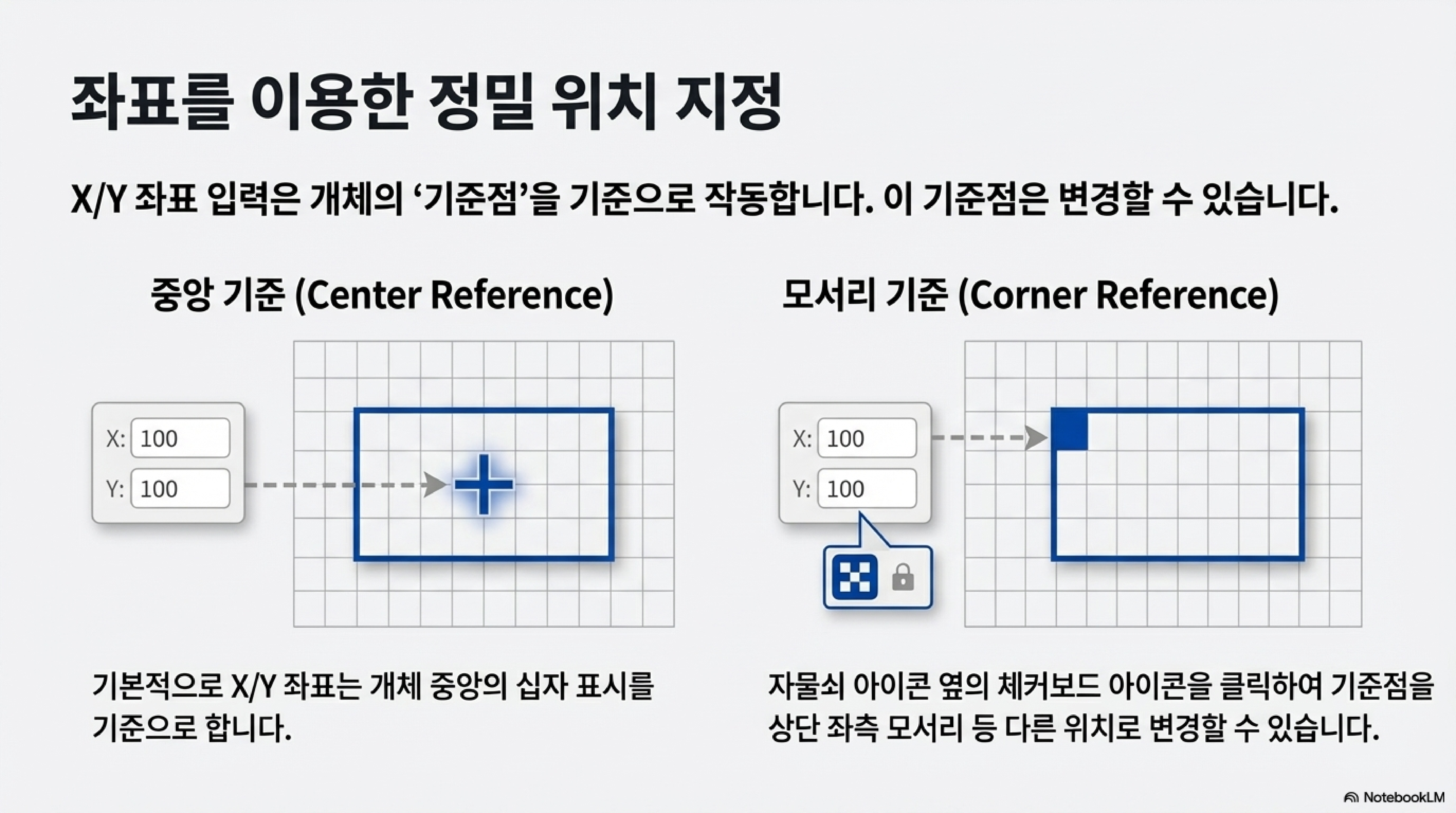 이것이 왜 중요할까요? 예를 들어, 객체의 기준점이 '중심'으로 설정된 상태에서 X/Y 좌표를 (100, 100)으로 입력하면 객체의 중심이 해당 위치로 이동합니다. 하지만 기준점을 '왼쪽 상단 모서리'로 변경하고 똑같이 (100, 100)을 입력하면, 이번에는 객체의 왼쪽 상단 모서리가 해당 위치에 놓이게 됩니다. 이처럼 기준점을 변경하는 기능은 도면의 특정 지점에 객체를 매우 정밀하게 배치해야 할 때 필수적입니다.