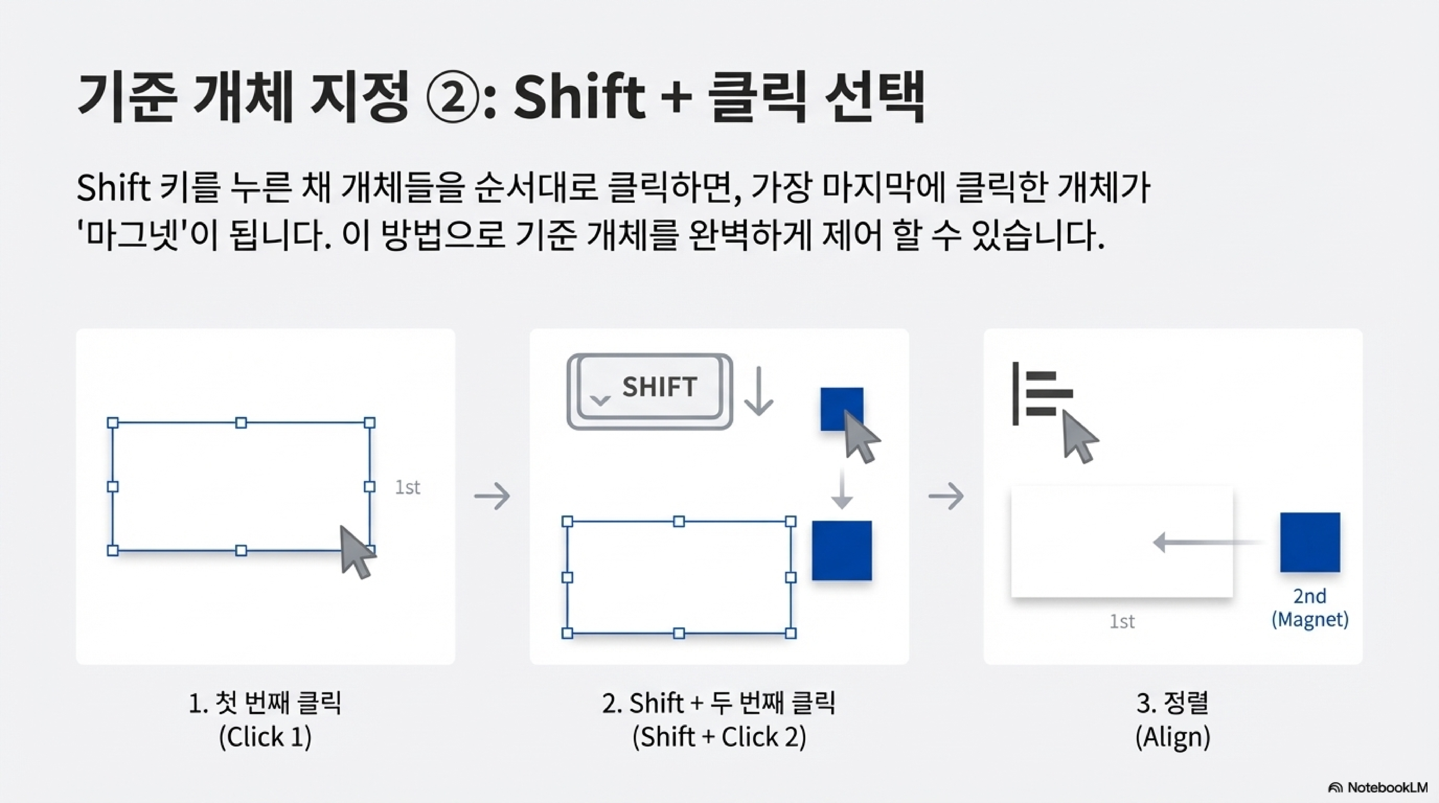 하지만 더 강력하고 유용한 방법이 있습니다. Shift 키를 누른 상태로 객체들을 차례로 선택하면, 가장 마지막에 선택한 객체를 '자석'으로 직접 지정할 수 있습니다. 이 방법을 사용하면 그리고 순서와 상관없이 정렬의 기준을 자유자재로 제어할 수 있습니다.