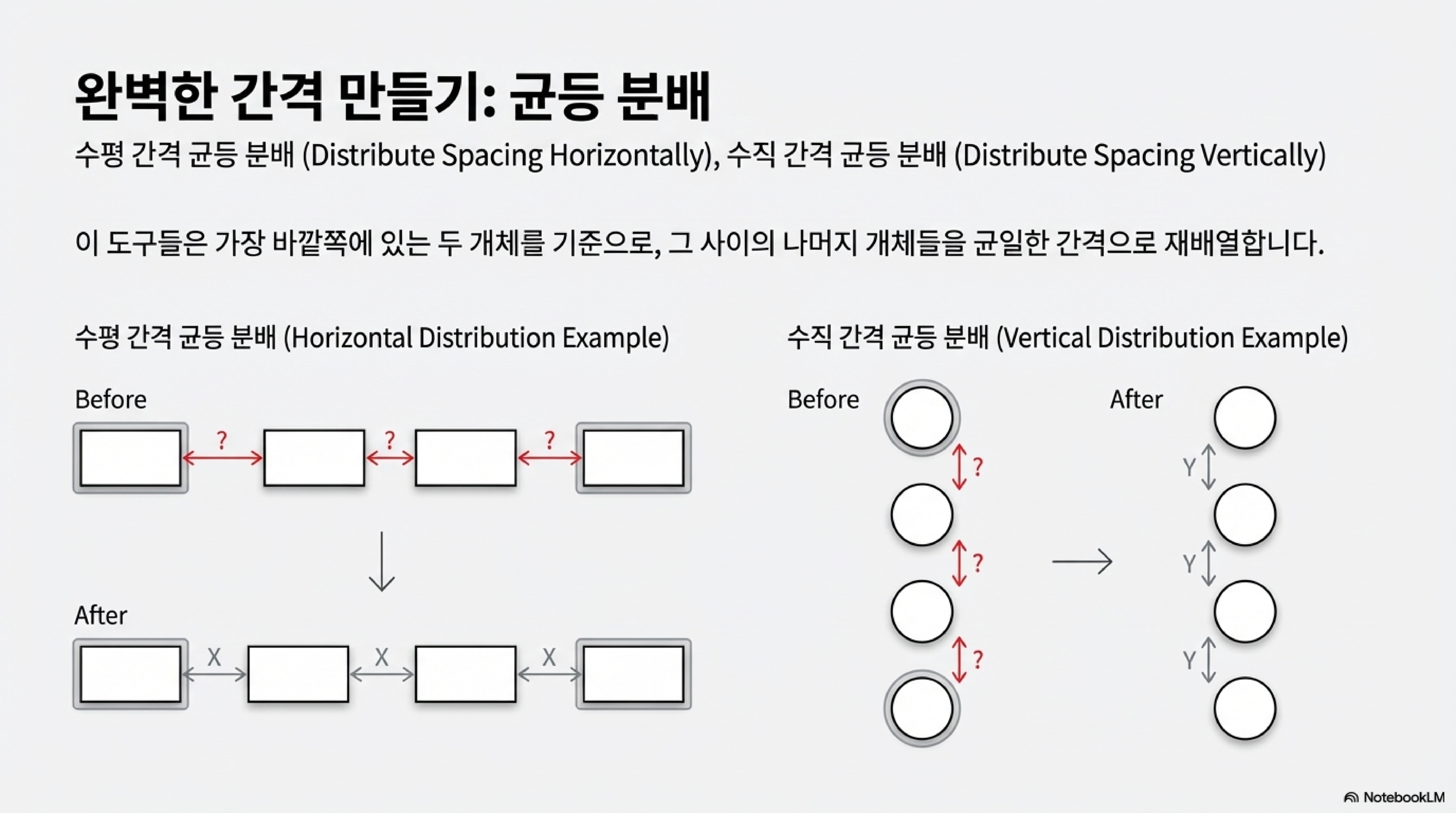 이 도구의 작동 원리는 간단합니다. 여러 객체를 선택한 상태에서 분배 도구를 클릭하면, 가장 양 끝에 있는 두 객체는 움직이지 않고 그 사이의 나머지 객체들이 일정한 간격으로 완벽하게 재배치됩니다. 즉, 양 끝 객체가 기준선이 되고, 그 안에서 공간이 균등하게 분할되는 것입니다.