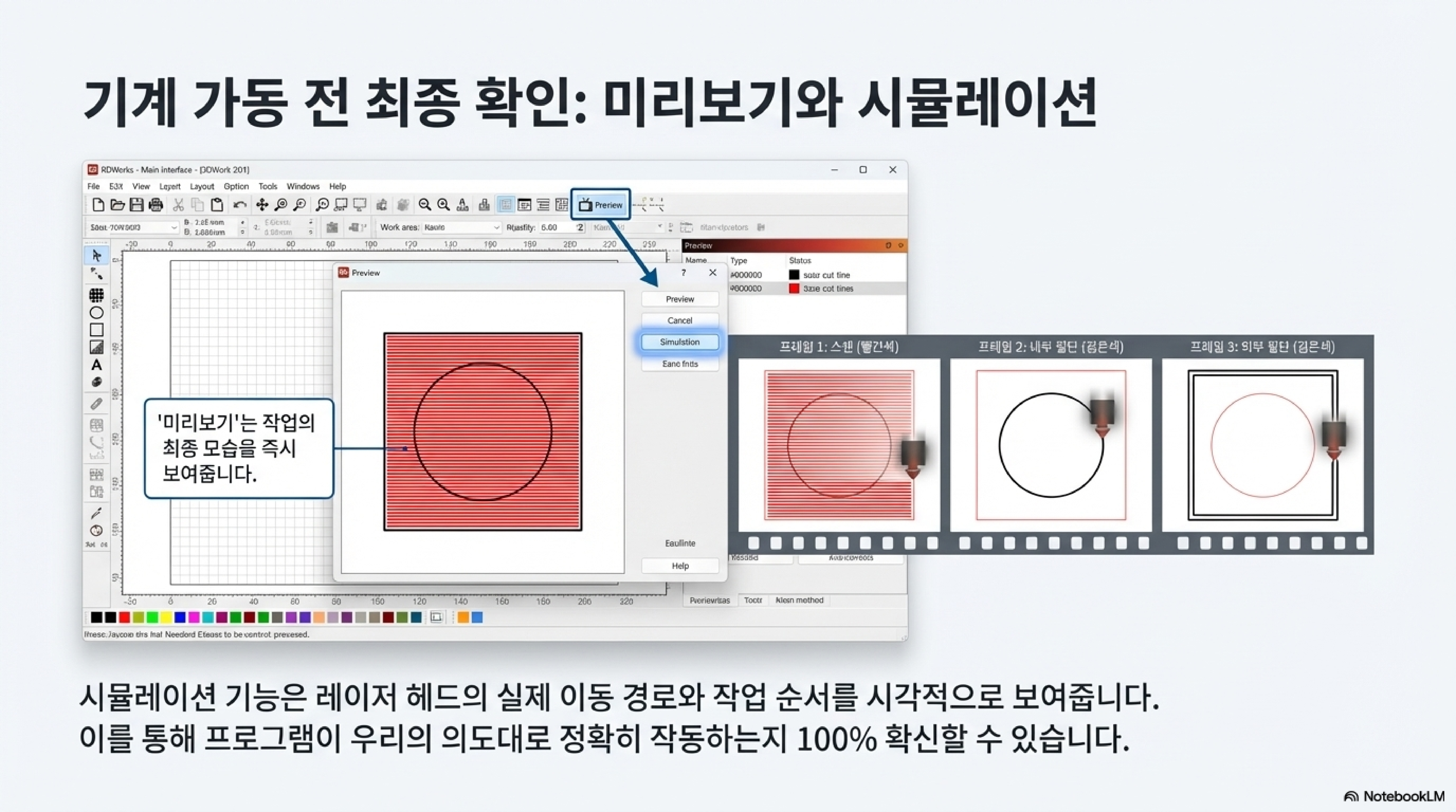 - 미리보기 기능: 프로그램을 기계로 전송하기 전에 '미리보기(preview)' 기능을 반드시 활용하세요. 이 기능을 통해 스캔 라인과 절단 경로가 의도한 대로 구현되는지 시뮬레이션해볼 수 있어, 재료와 시간을 낭비하는 실수를 미연에 방지할 수 있습니다.