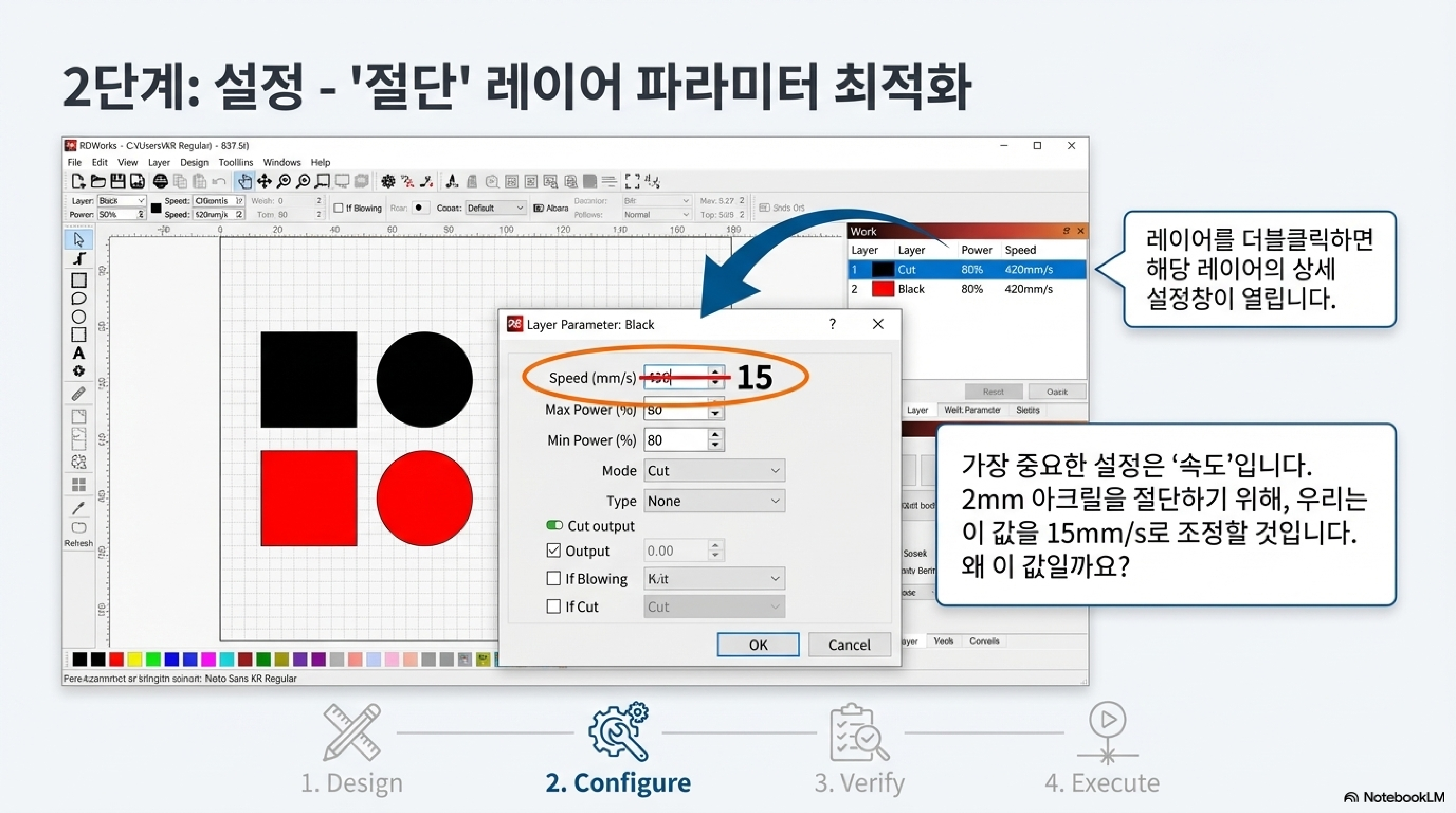 RDWorks에서는 각기 다른 작업을 별도의 '레이어(layer)'로 관리합니다. 예를 들어, 재료의 표면을 얕게 파내는 '스캔' 작업은 빨간색 레이어로, 재료를 완전히 관통해 잘라내는 '컷' 작업은 검은색 레이어로 지정할 수 있습니다. 여기서 가장 중요한 점은, 기계가 이 레이어들을 소프트웨어에 표시된 순서대로 처리한다는 것입니다.