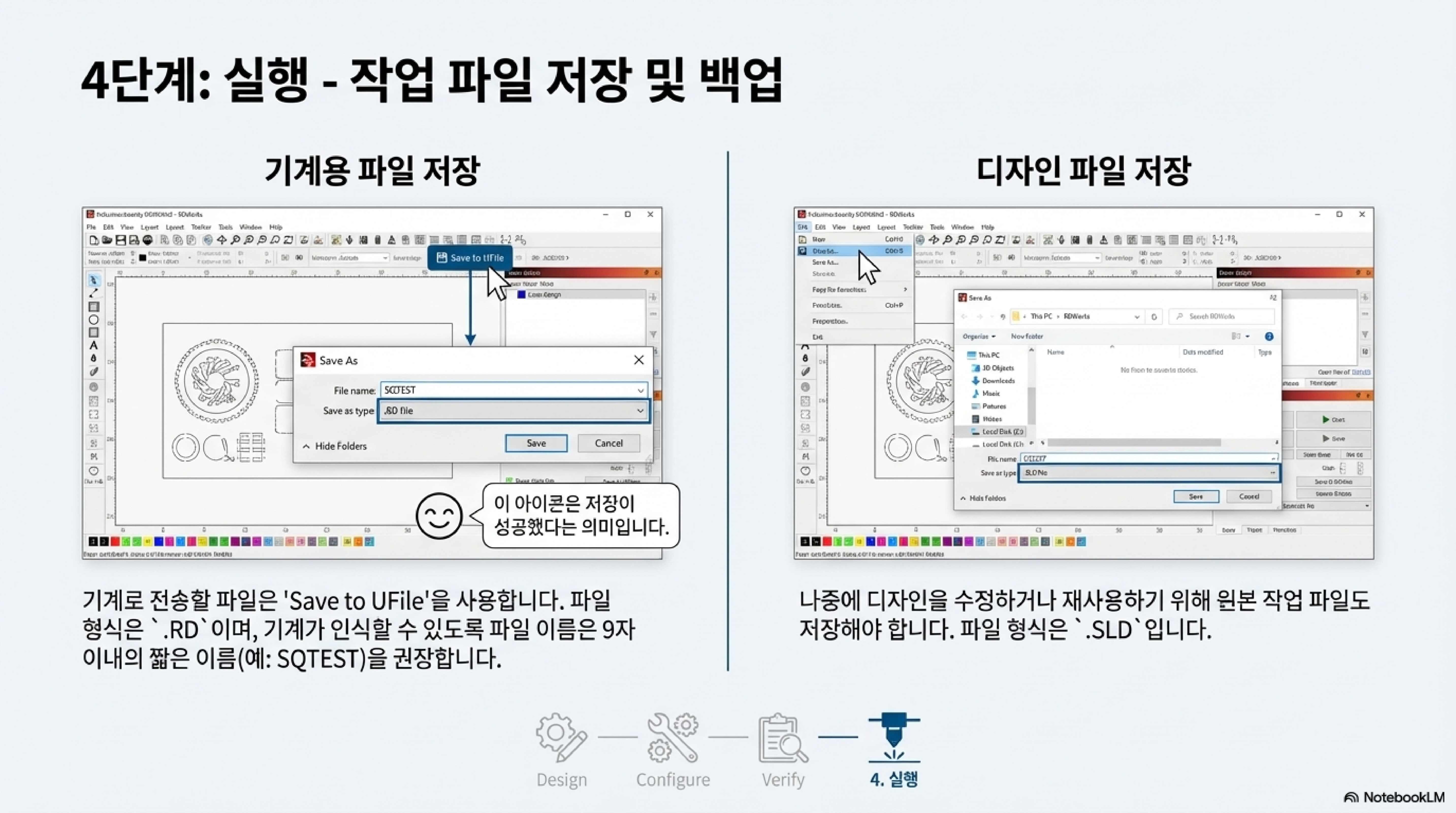 - 이중 저장: 작업을 두 번 저장해야 합니다. 하나는 기계가 읽을 수 있는 머신 파일(.RD 파일)이고, 다른 하나는 나중에 디자인을 수정할 수 있도록 원본 도면인 .SLD 파일입니다. 저는 테스트 파일을 "Square Test"의 약자인 s Q test라는 이름으로 저장했습니다.