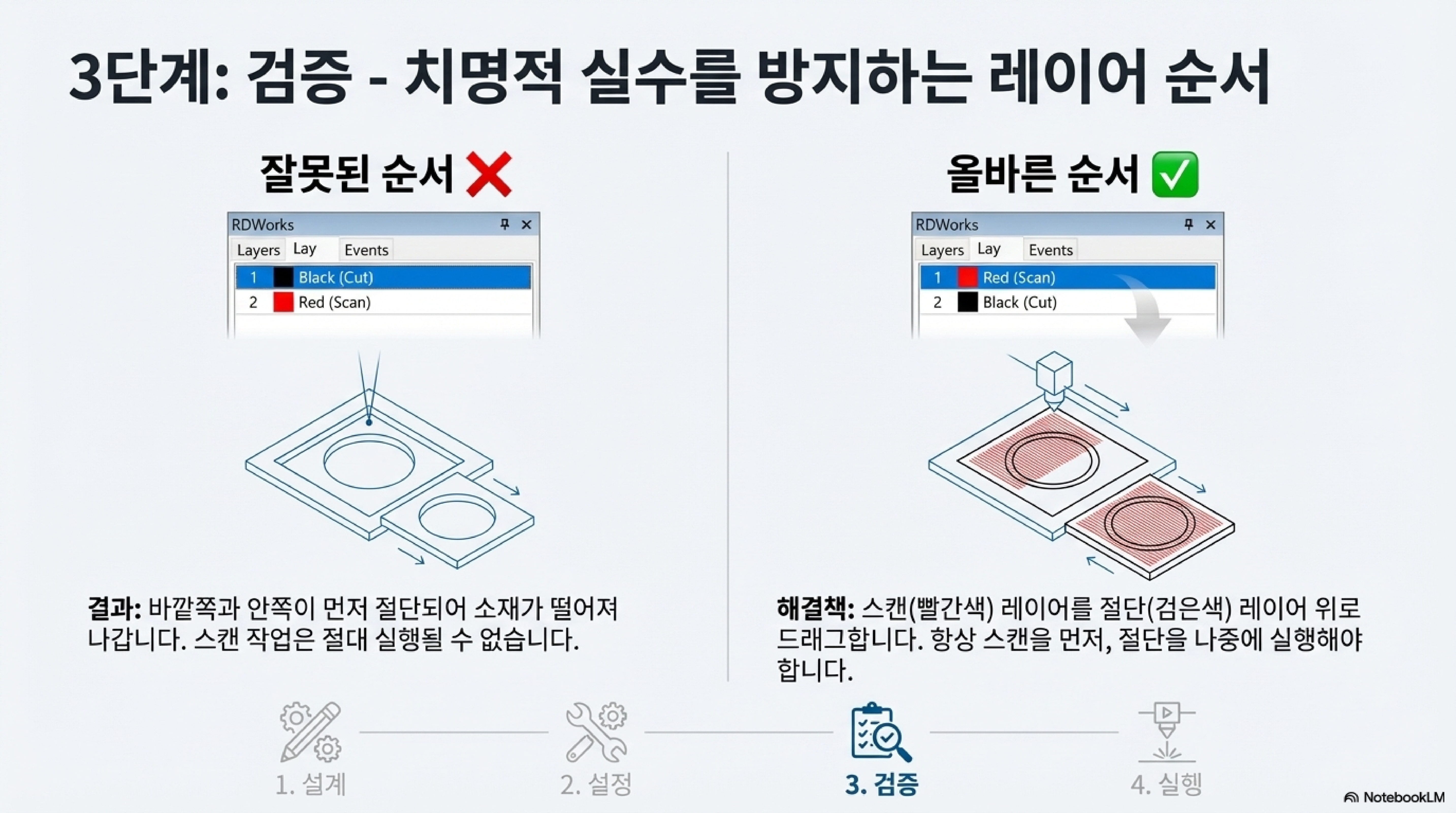 만약 작업 순서가 잘못되면 끔찍한 결과가 발생할 수 있습니다. 예를 들어, 컷 레이어(검은색)가 스캔 레이어(빨간색)보다 먼저 처리되도록 설정되어 있다고 상상해 보세요. 기계는 먼저 외곽선을 따라 재료를 잘라낼 것입니다. 그 결과, 작업물 조각이 재료에서 떨어져 나가버리고, 정작 중요한 스캔(에칭) 작업은 허공에 이루어지게 됩니다.