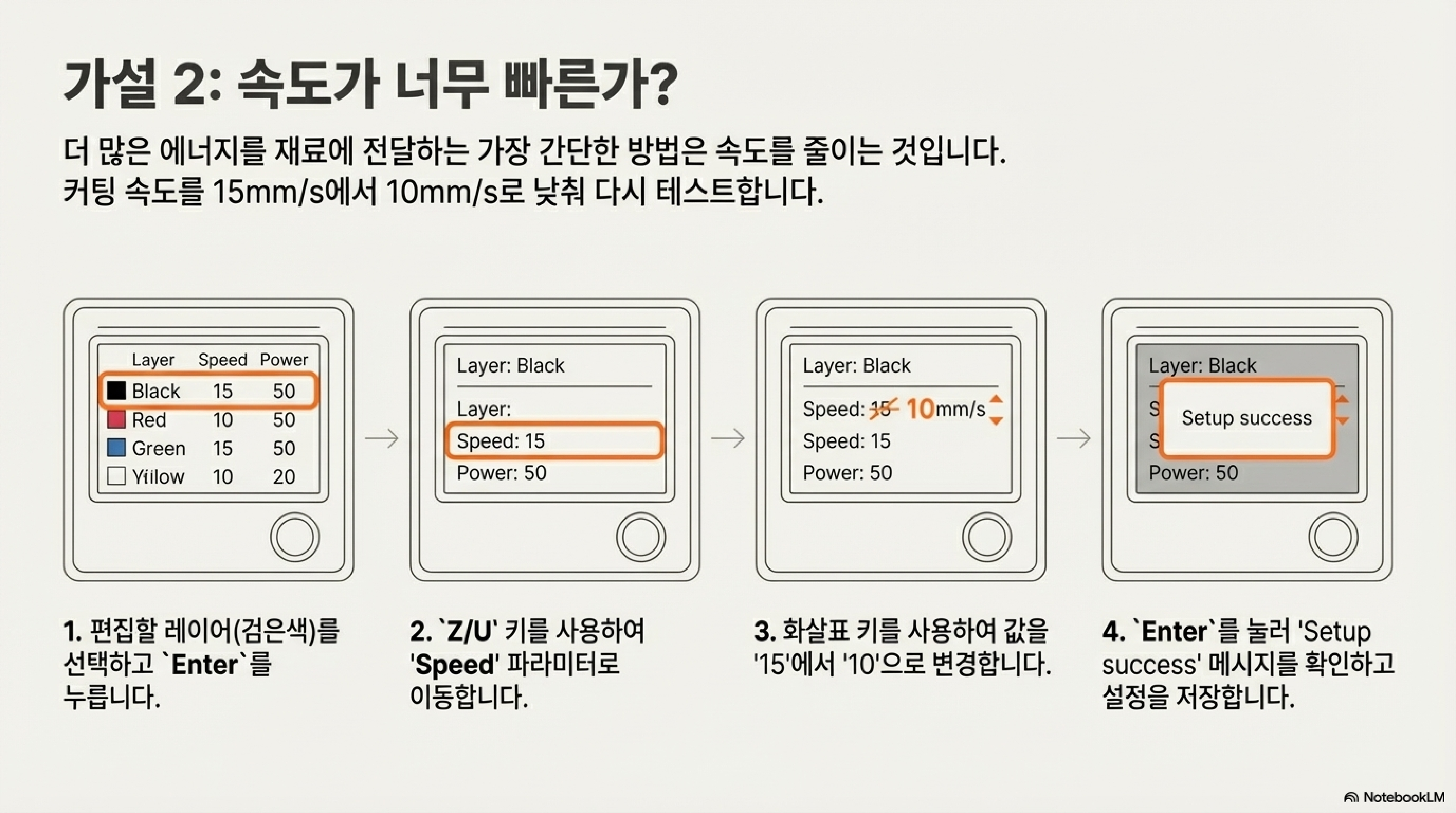 에어 어시스트를 켜고 다시 작업을 시도했지만, 여전히 문제가 있었습니다. 재료가 완전히 잘리지 않은 것입니다. 가장 먼저 든 생각은 '파워가 약하거나 속도가 너무 빠른가?'였습니다. 그래서 속도를 15mm/s에서 10mm/s로 낮춰 다시 시도했습니다. 하지만 결과는 마찬가지였습니다.