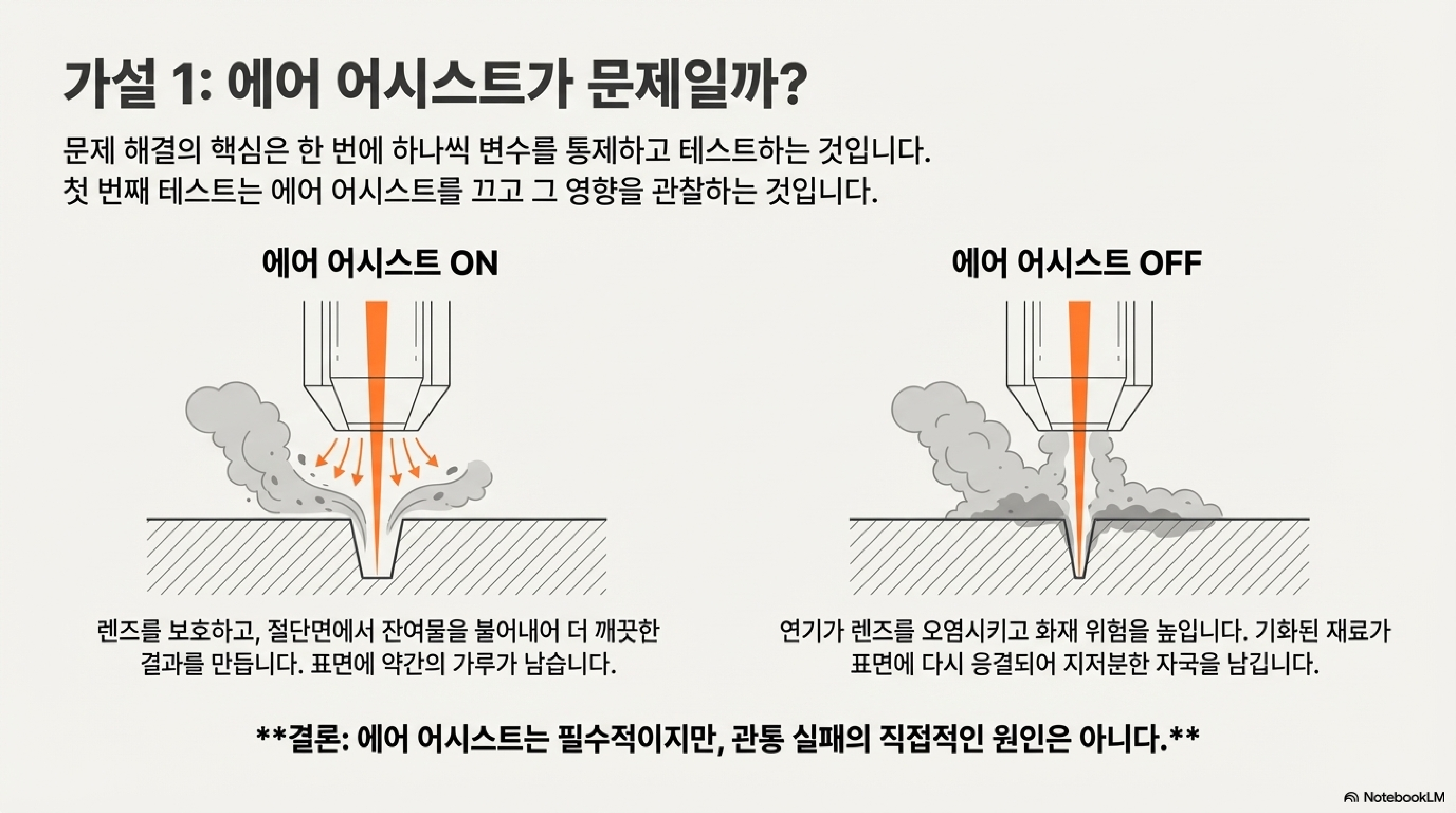 경로 확인 후 드디어 첫 커팅을 시작했습니다. 그런데 작업 중 예상보다 많은 연기가 피어오르고 절단면 주변에 하얀 가루 같은 잔여물이 생기는 것을 발견했습니다. 이것이 바로 '에어 어시스트(Air Assist)'의 중요성을 깨닫게 된 순간이었습니다. 에어 어시스트는 단순히 보조 기능이 아니라, 결과물의 품질과 장비 보호에 결정적인 역할을 하는 필수 기능입니다.