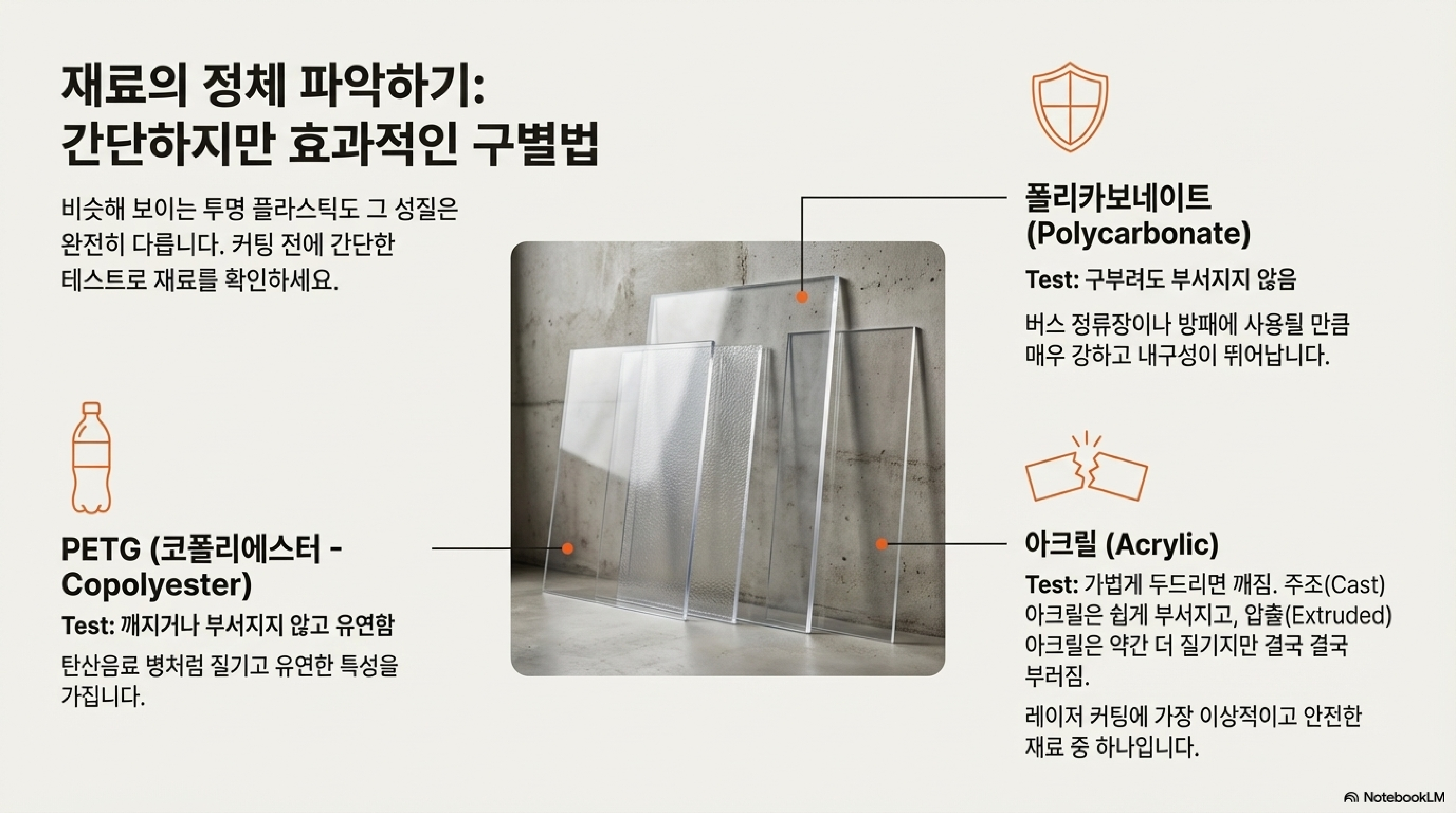 겉보기엔 비슷하지만 레이저 가공에 전혀 다른 결과를 보이는 대표적인 투명 재료들을 구분하는 조잡하지만 효과적인 방법이 있습니다.